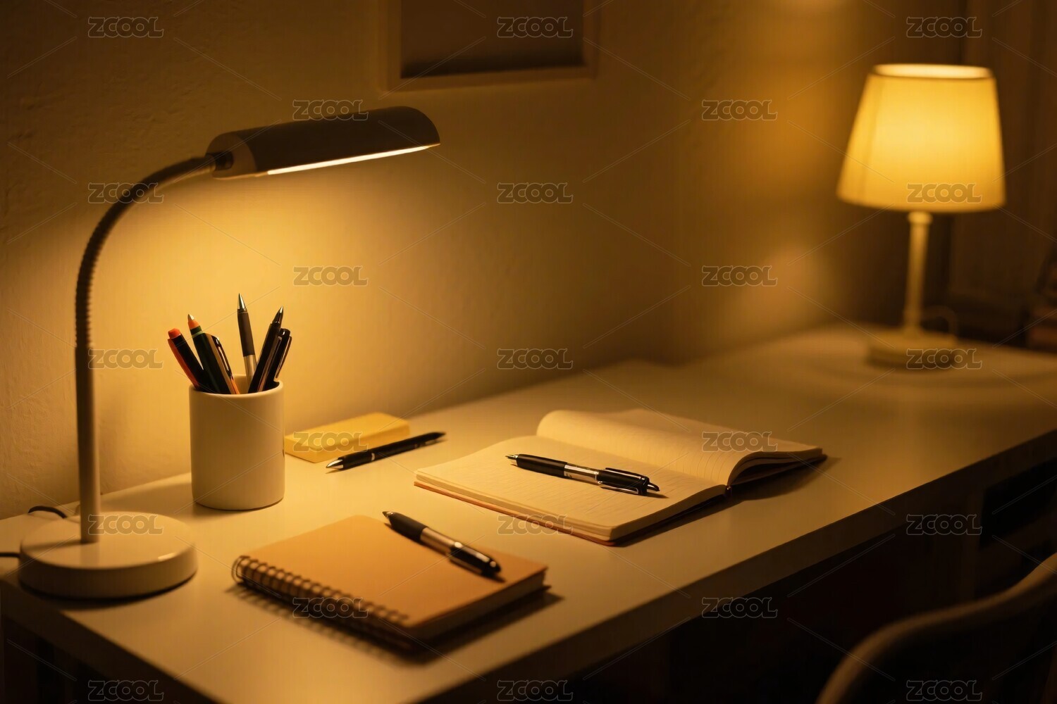书桌,台灯,电脑,书本,纸张,杯子,铅笔,窗户,椅子,墙面