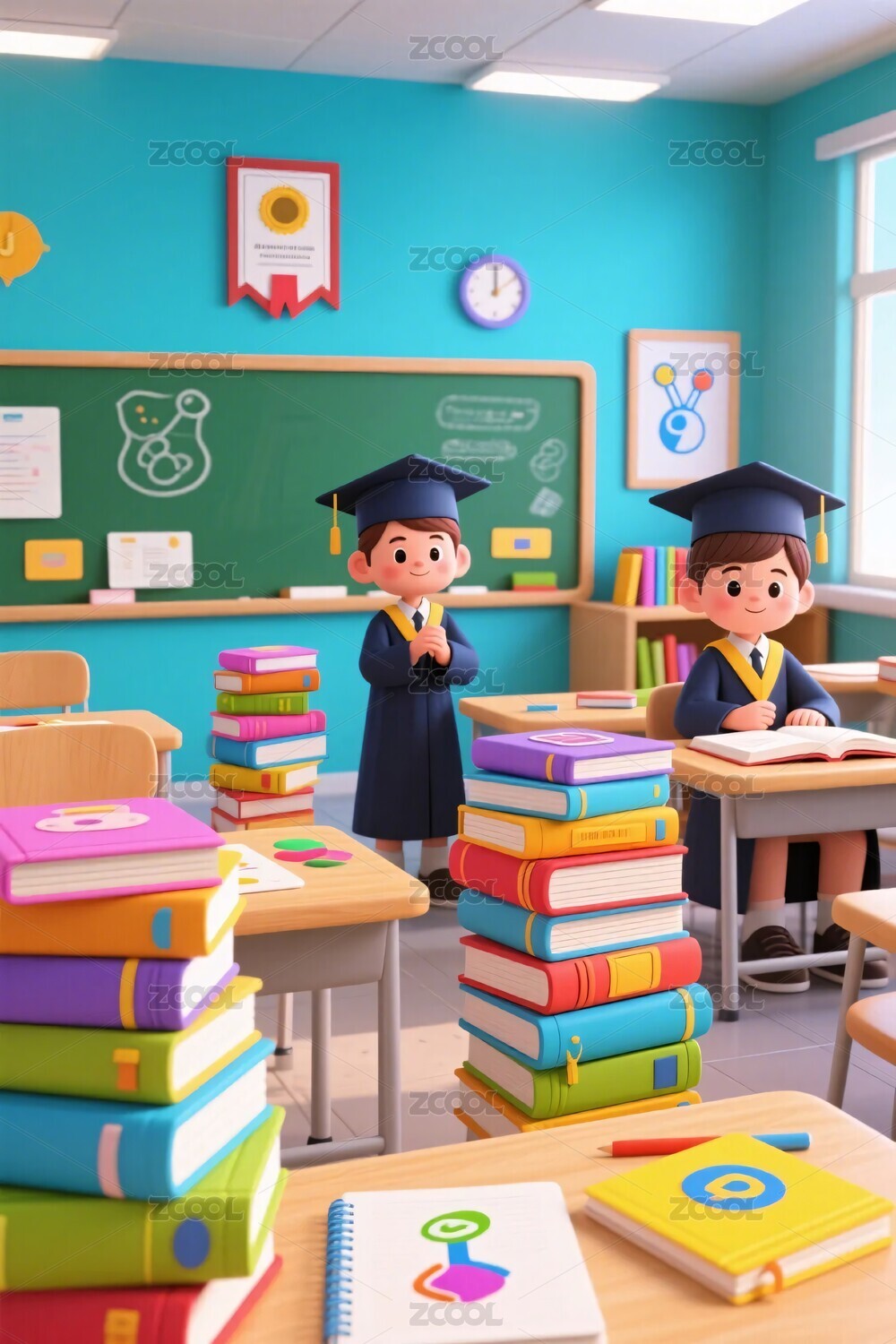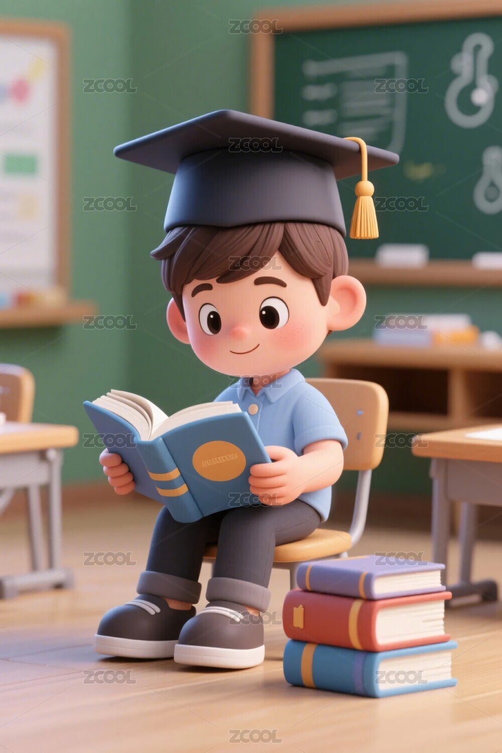 3d卡通戴毕业帽的毕业生坐在书籍上