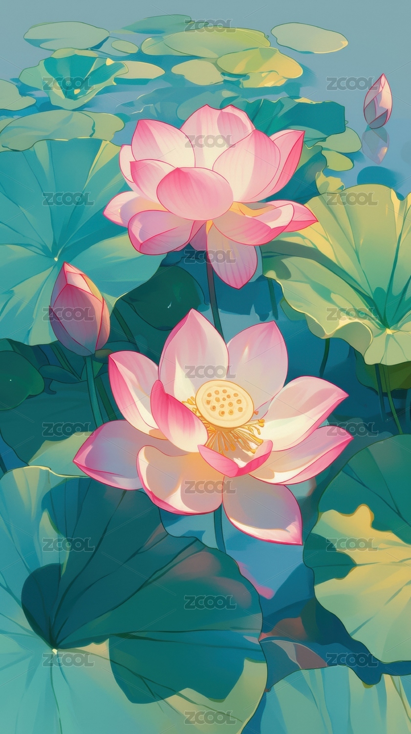 插画中的盛开荷花与花苞