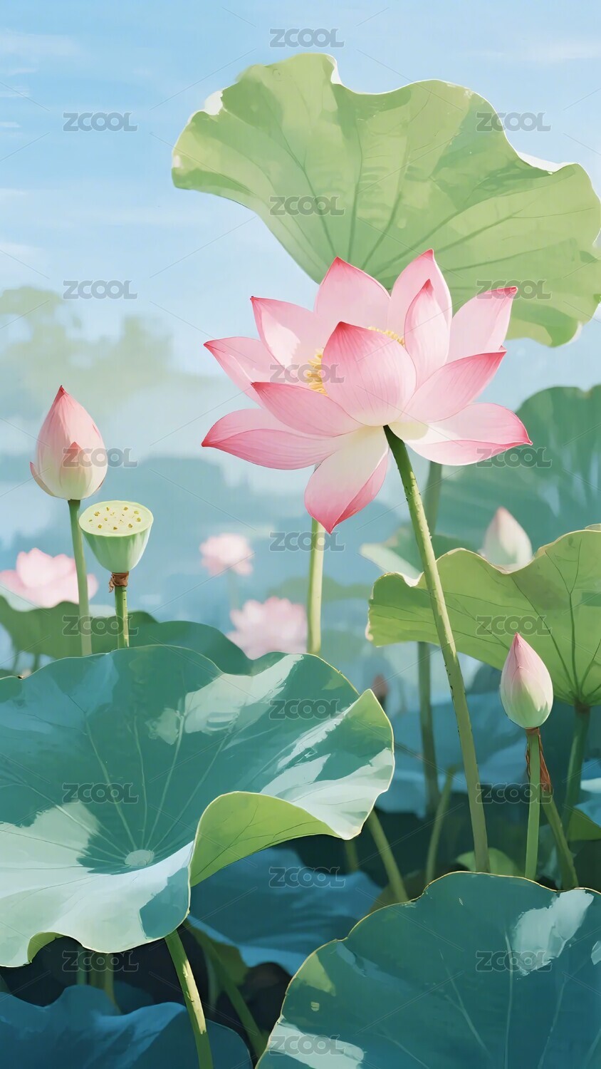 唯美插画风格的盛开荷花