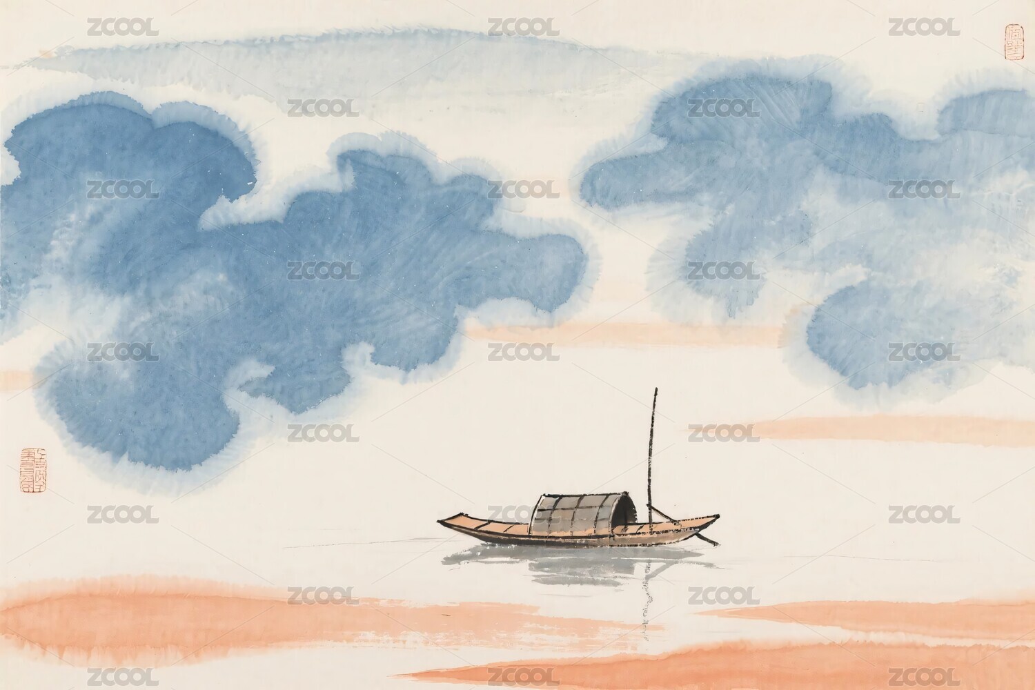 水墨船水风景插画