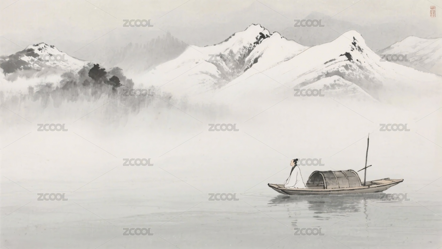 水墨山水间的孤舟图景