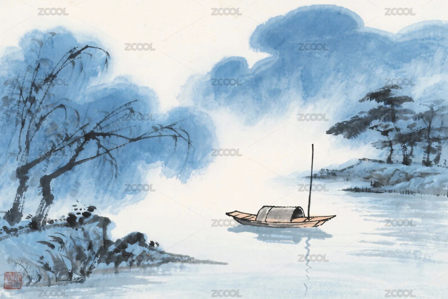 水墨山水小船