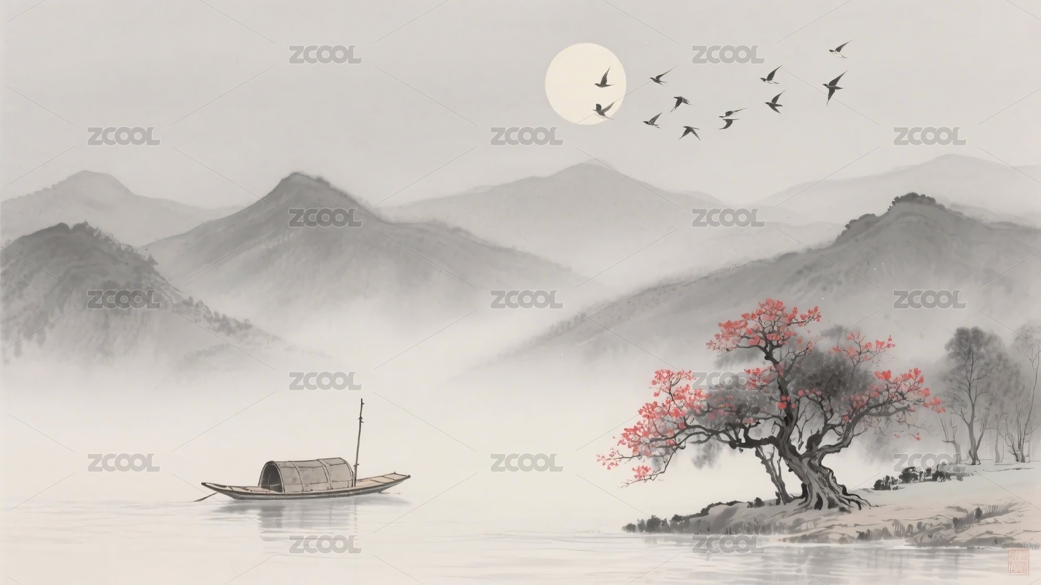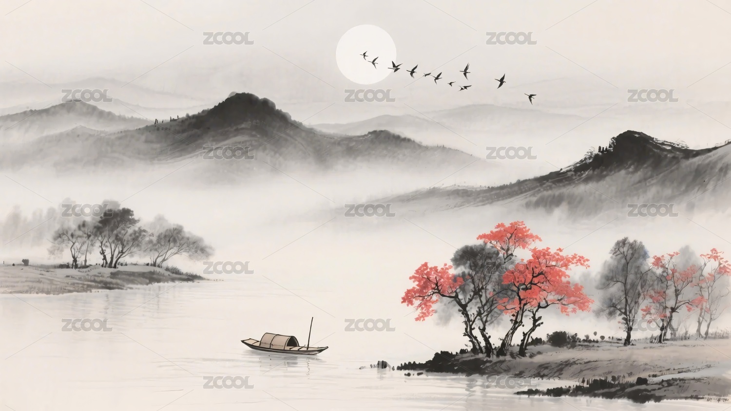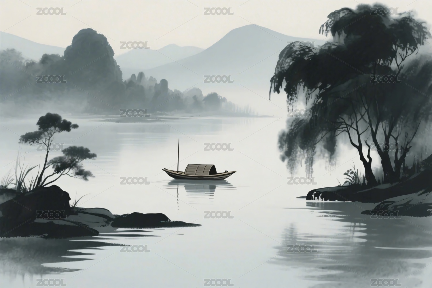 水墨画,山水,小船,河流,树木,远山,古画,风景,云雾,插画