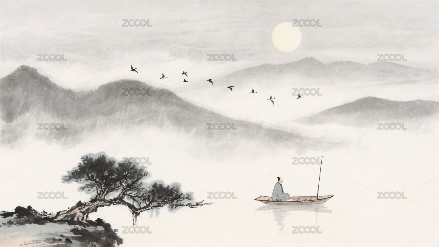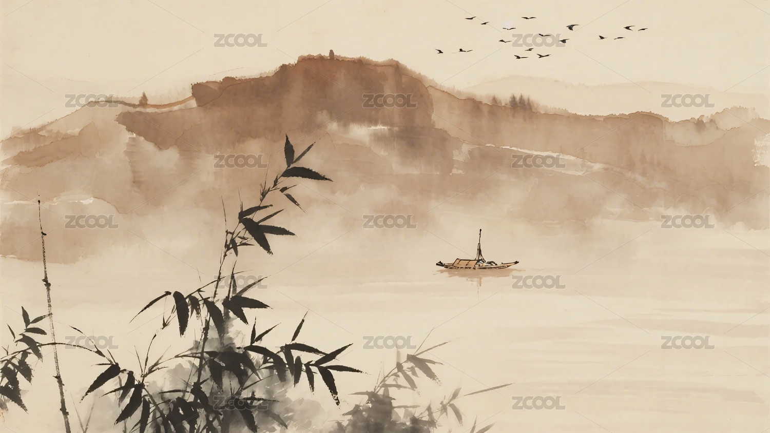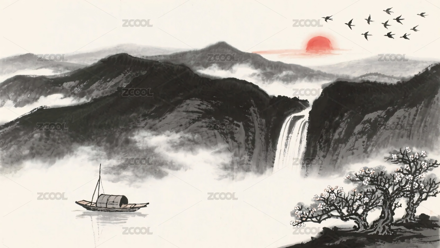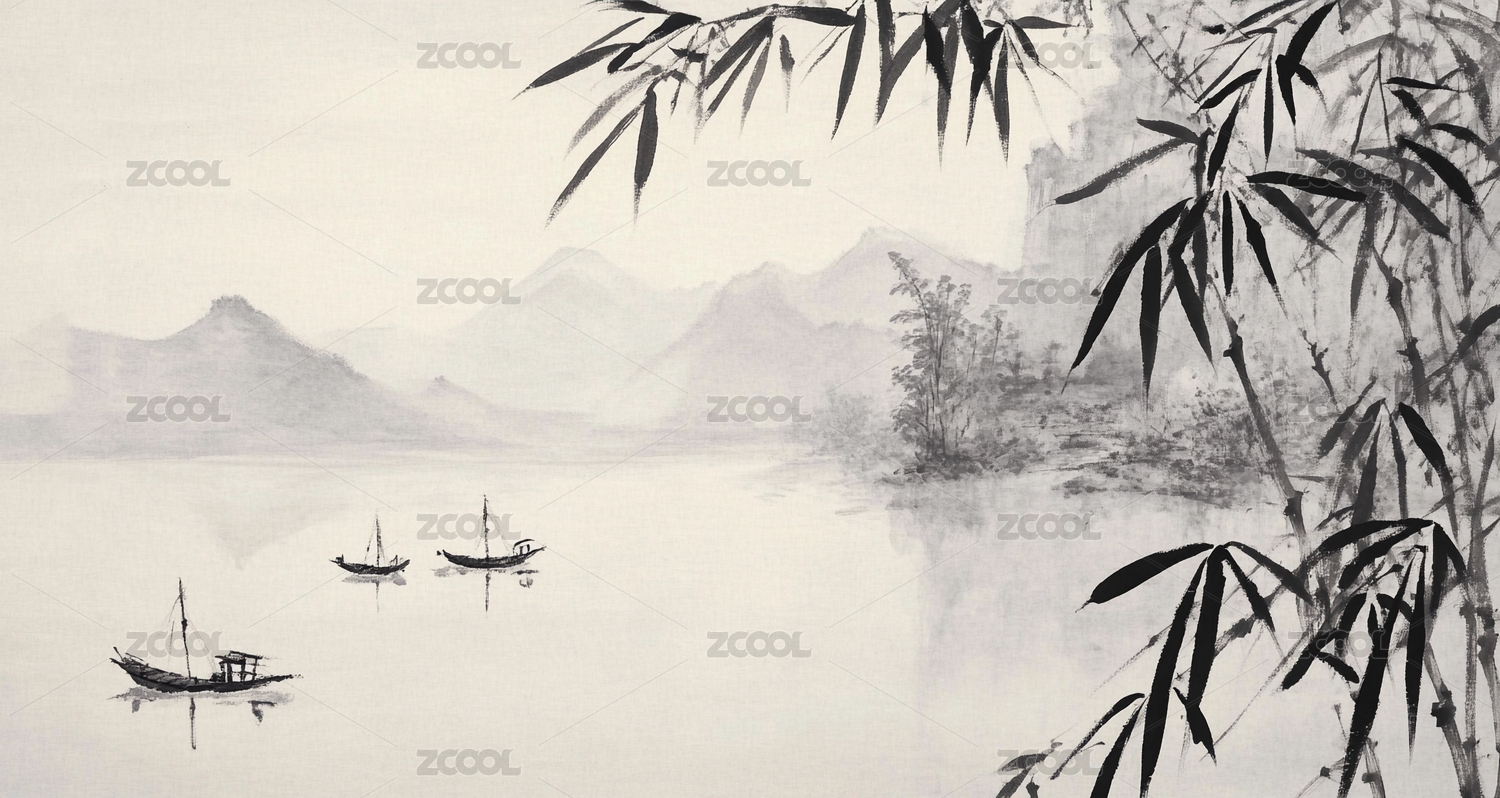 水墨画,山水,小船,河流,树木,远山,古画,风景,云雾,插画