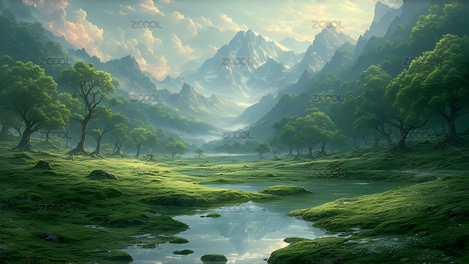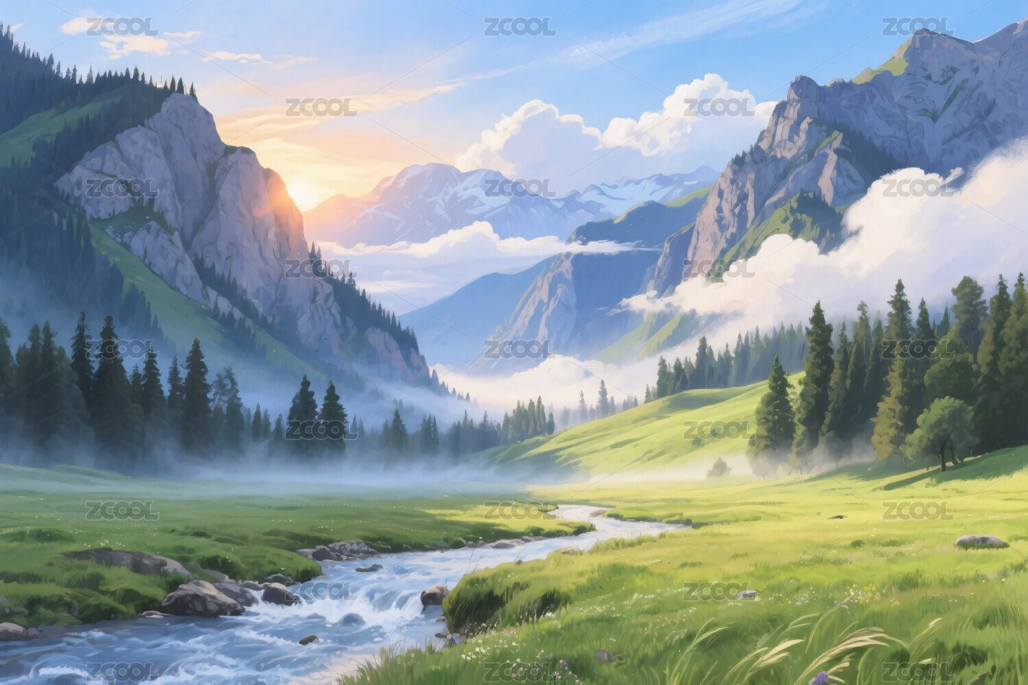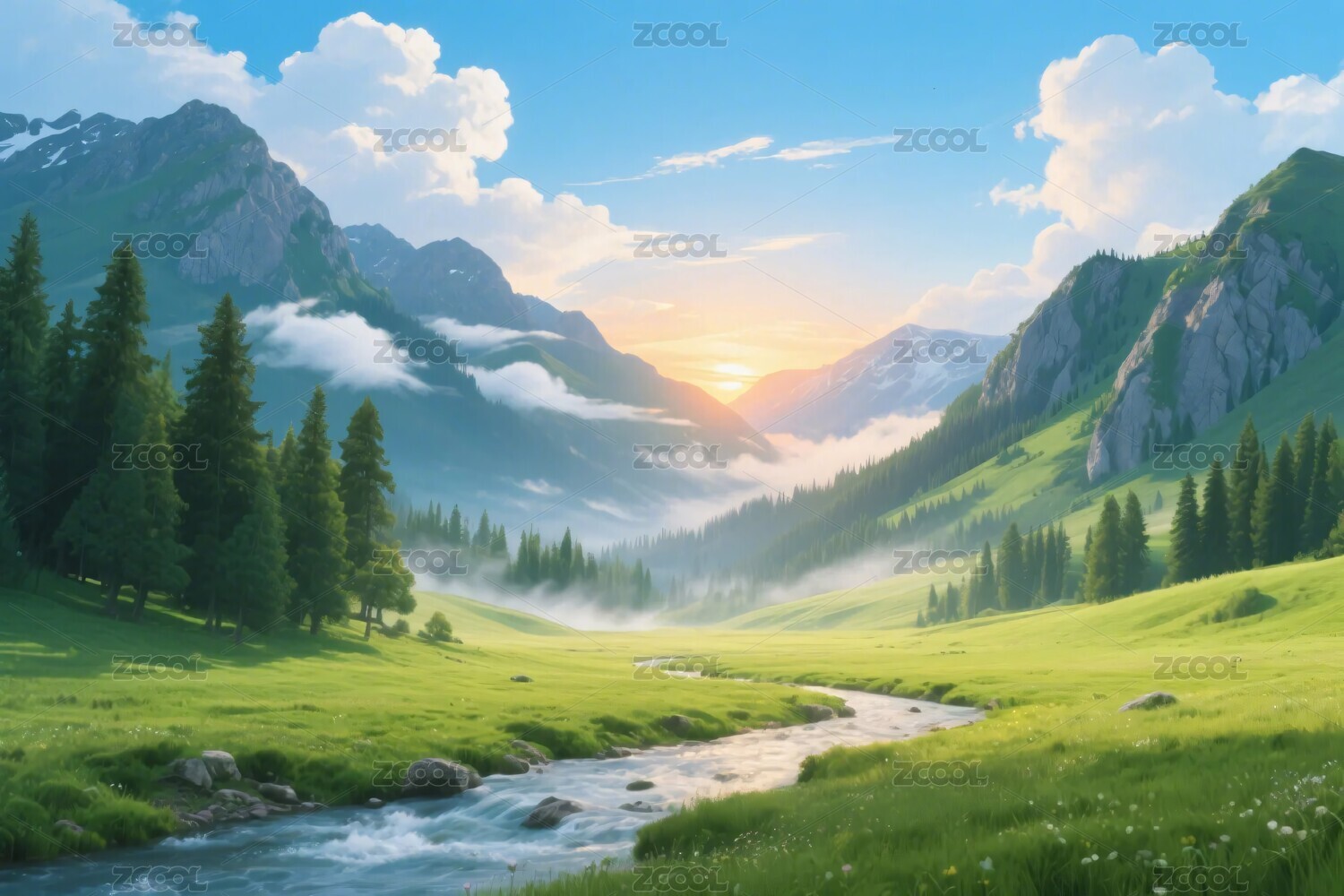 山水,雾气,树木,河流,草地,山峦,雾霭,风景,绿意,自然