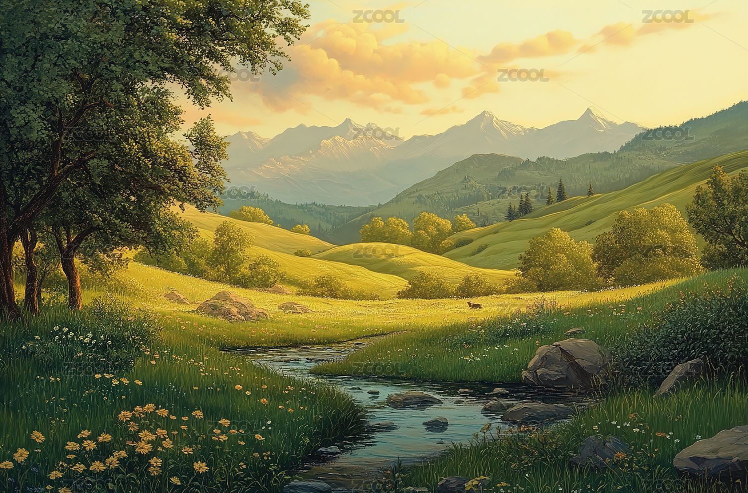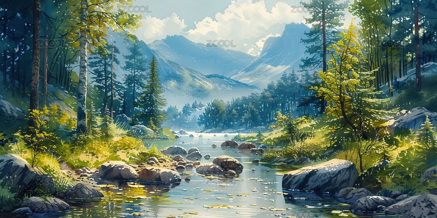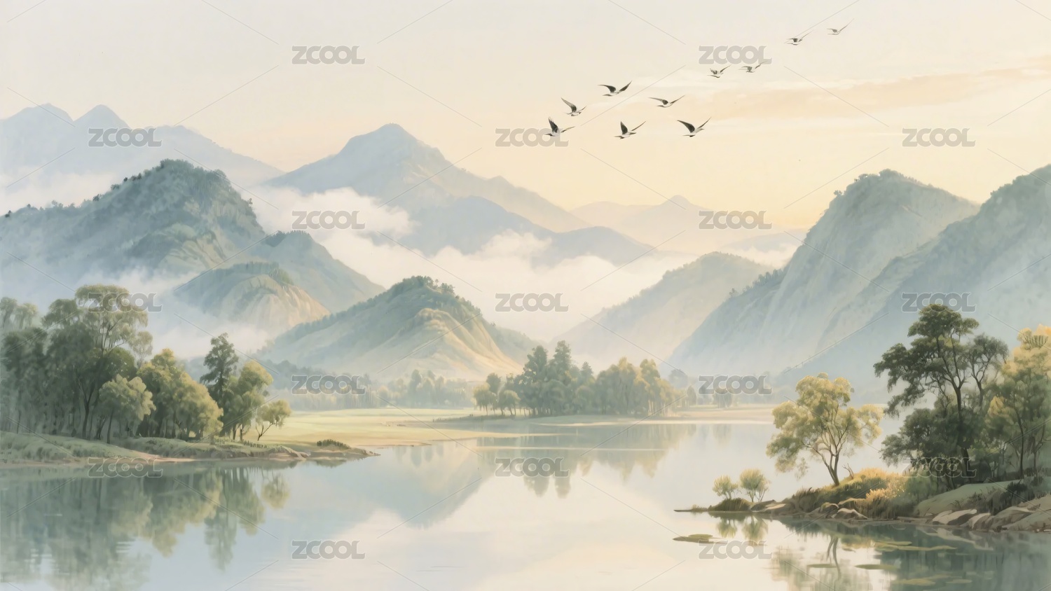 山水,雾气,树木,河流,草地,山峦,雾霭,风景,绿意,自然