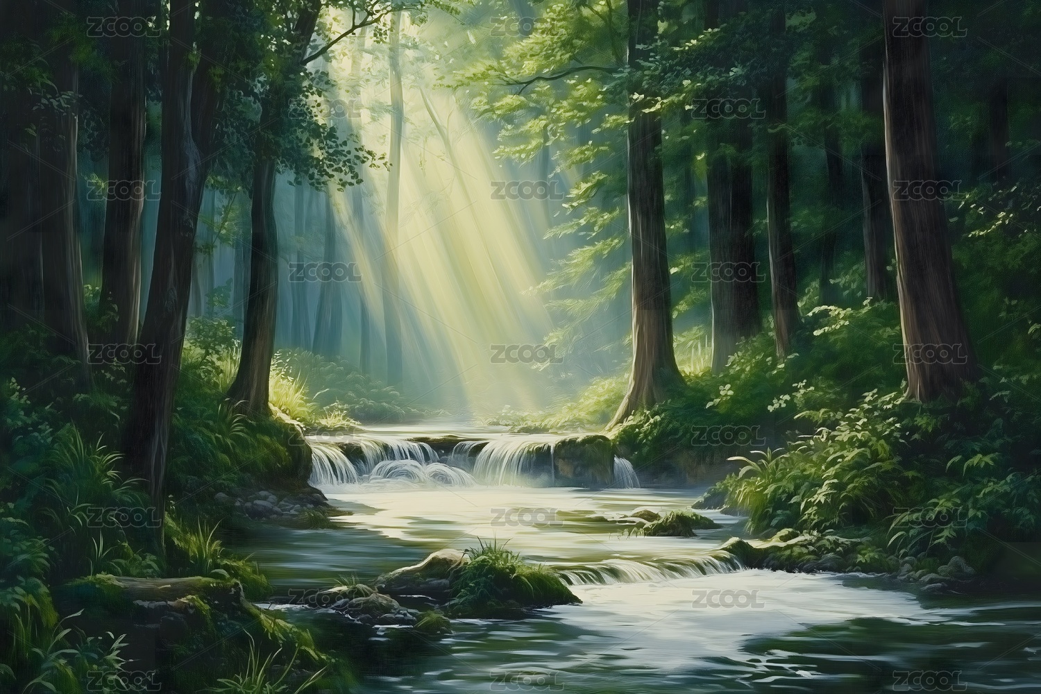 绿意盎然的丛林中缓缓流淌的小溪特写