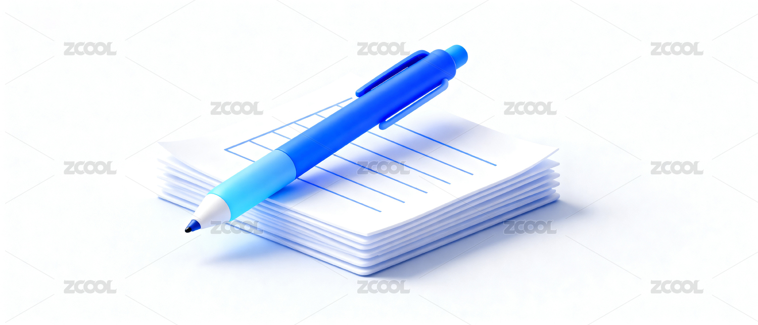 蓝色笔与白纸堆叠静物