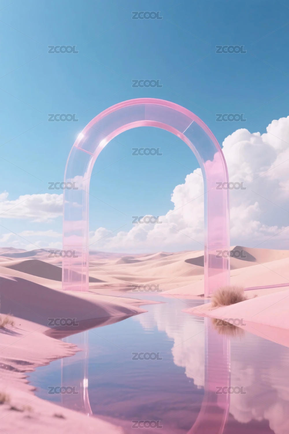 沙漠,水面,透明拱门,天空,云朵,奇幻场景,数字艺术,插画,未来感,梦幻
