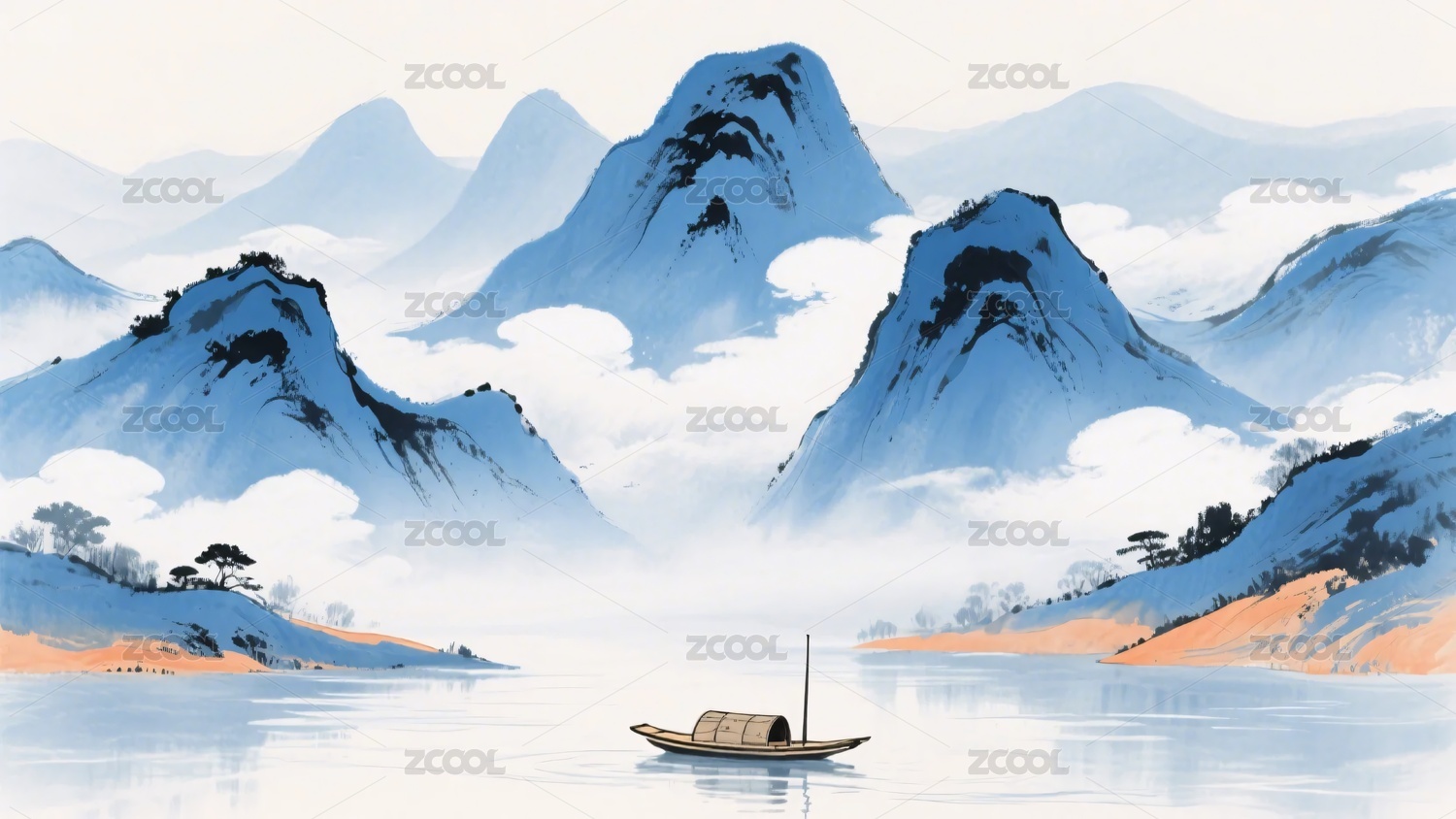 水墨风山水间的孤舟景色