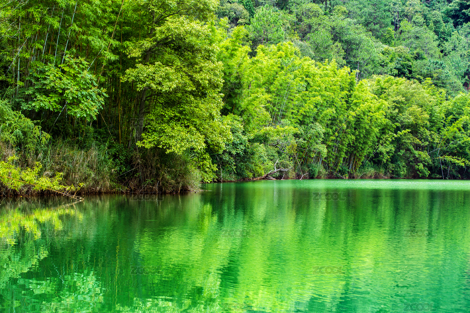 雅安喇叭河绿色森林倒影在翠绿湖面