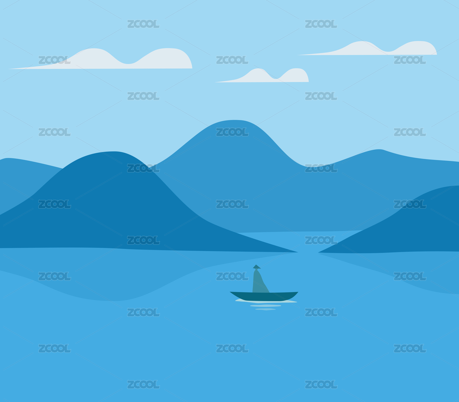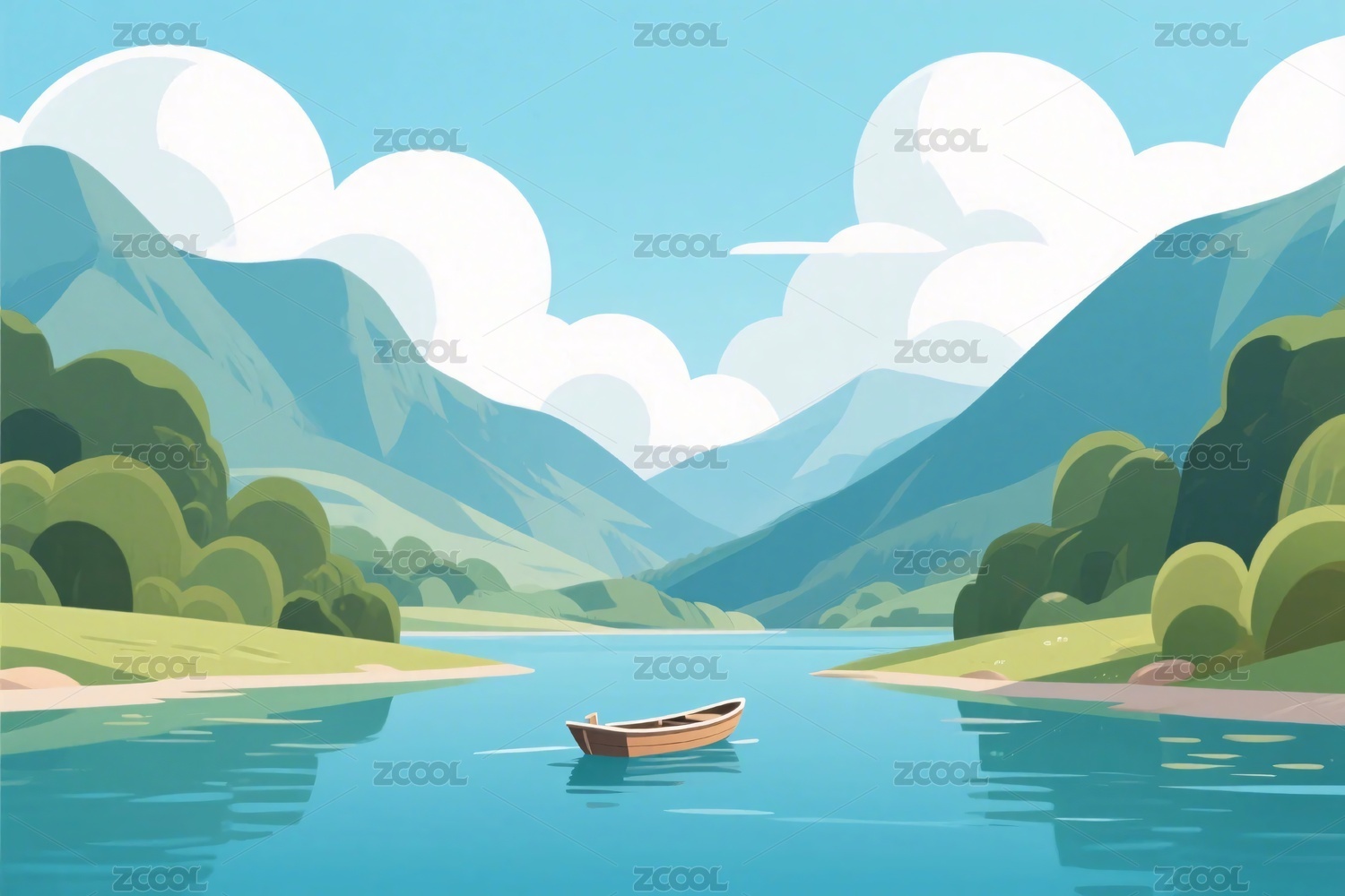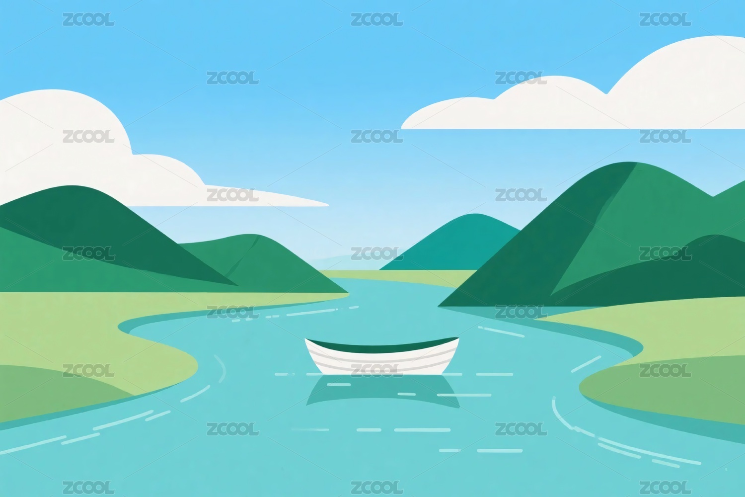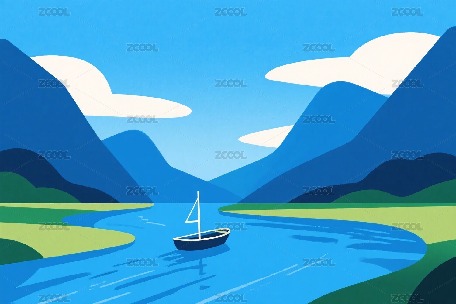 小船,山水,河流,天空,云朵,插画,风景,自然,宁静,蓝色调