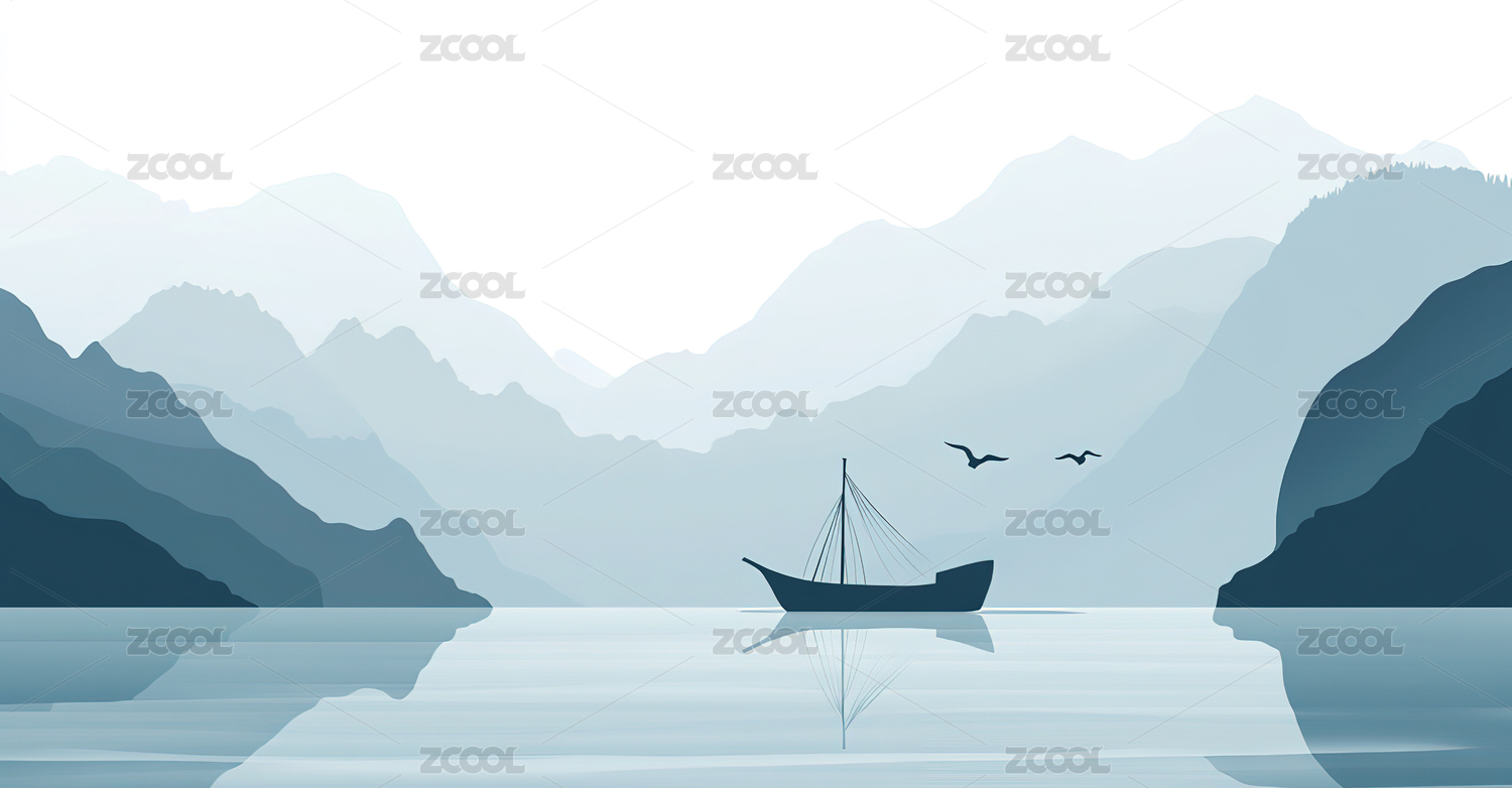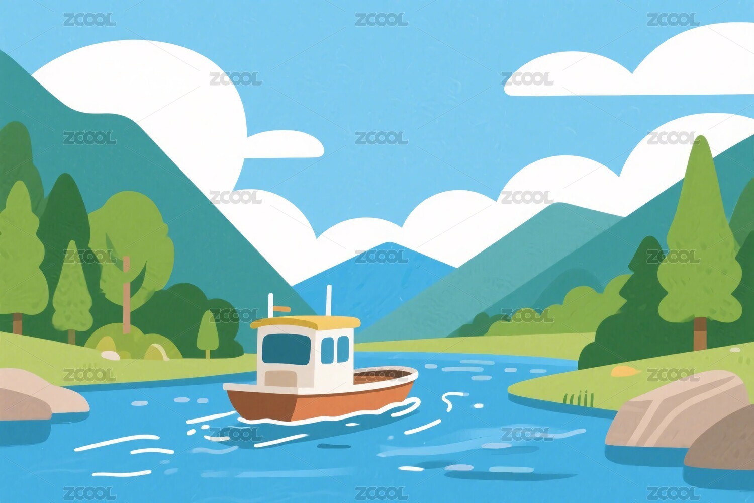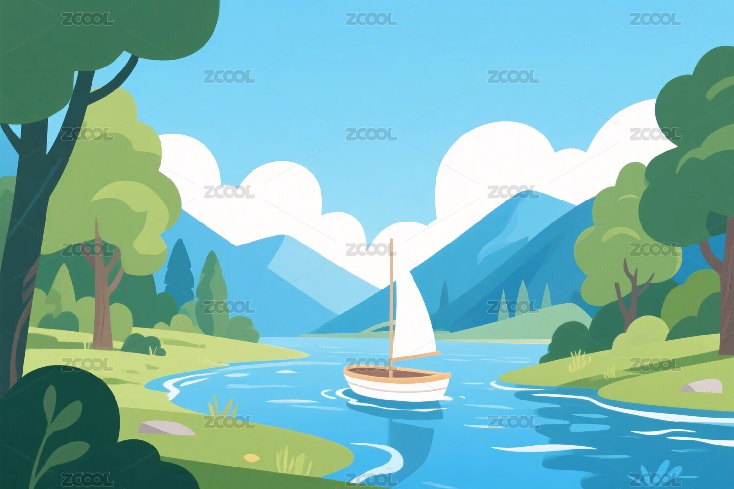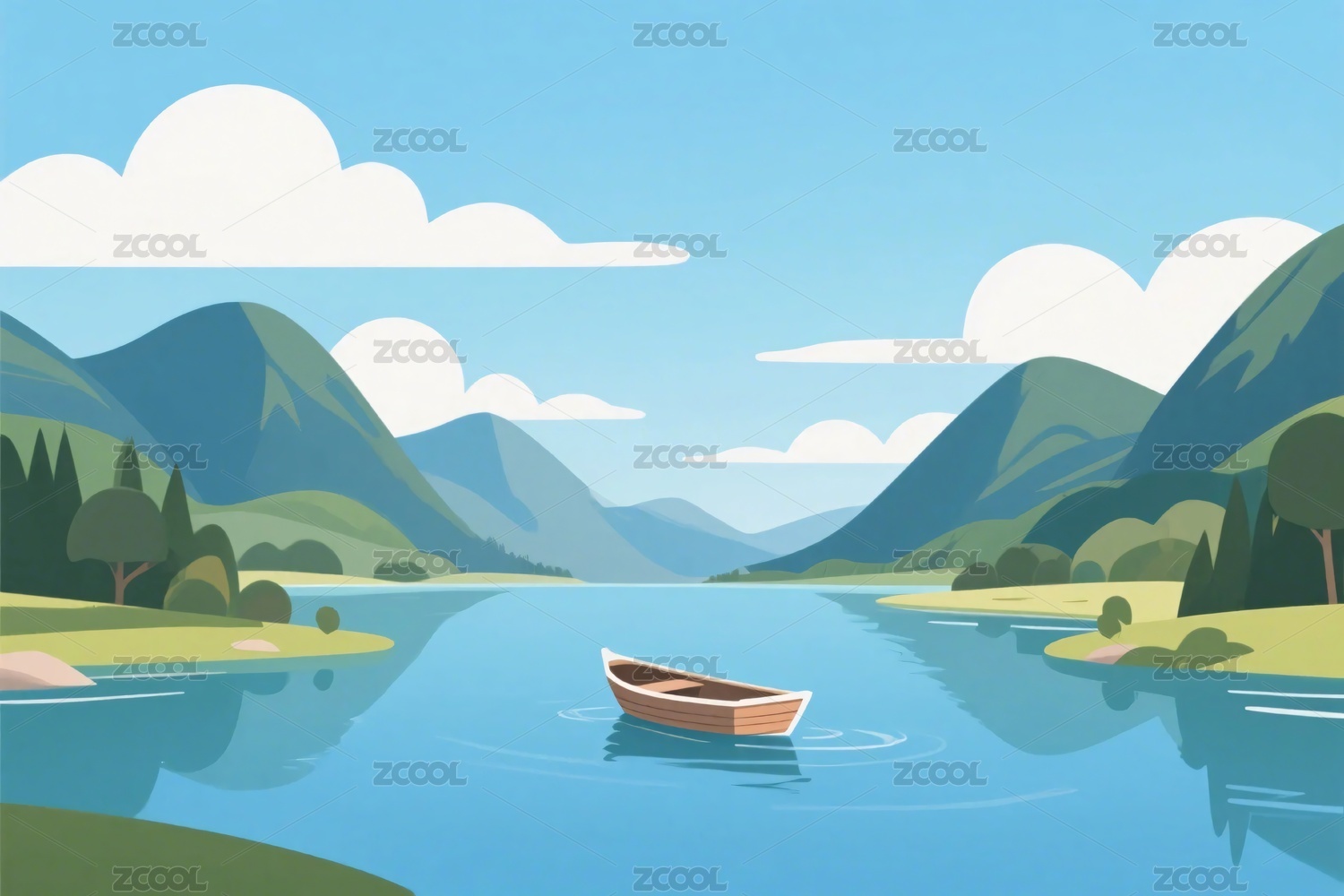 小船,山水,河流,天空,云朵,插画,风景,自然,宁静,蓝色调