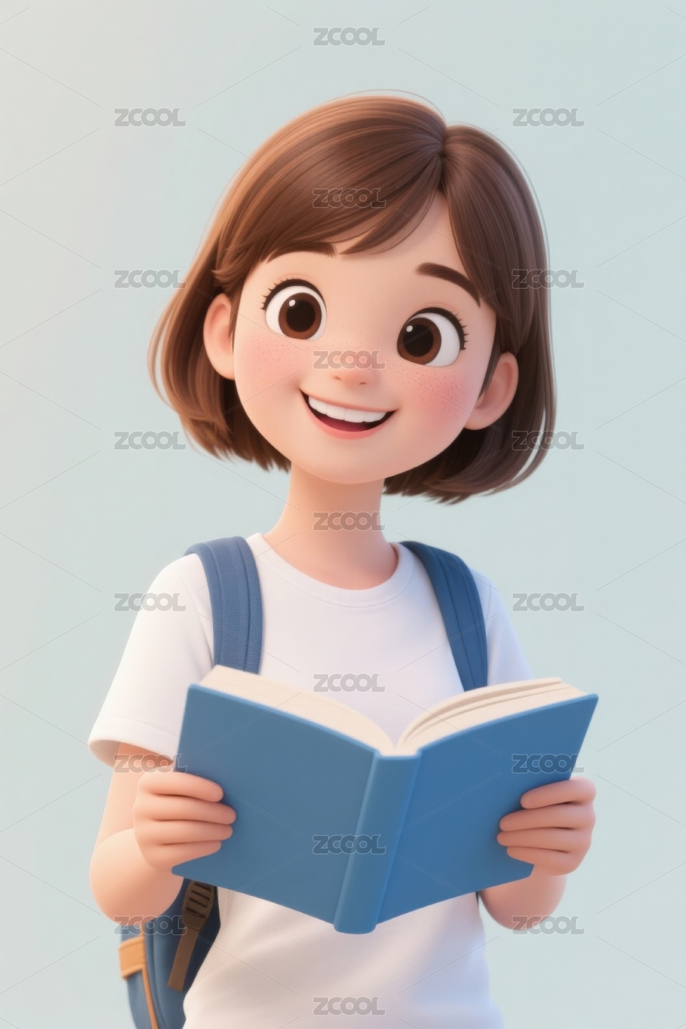 室内窗旁书桌前看书的女性3D卡通立体插画