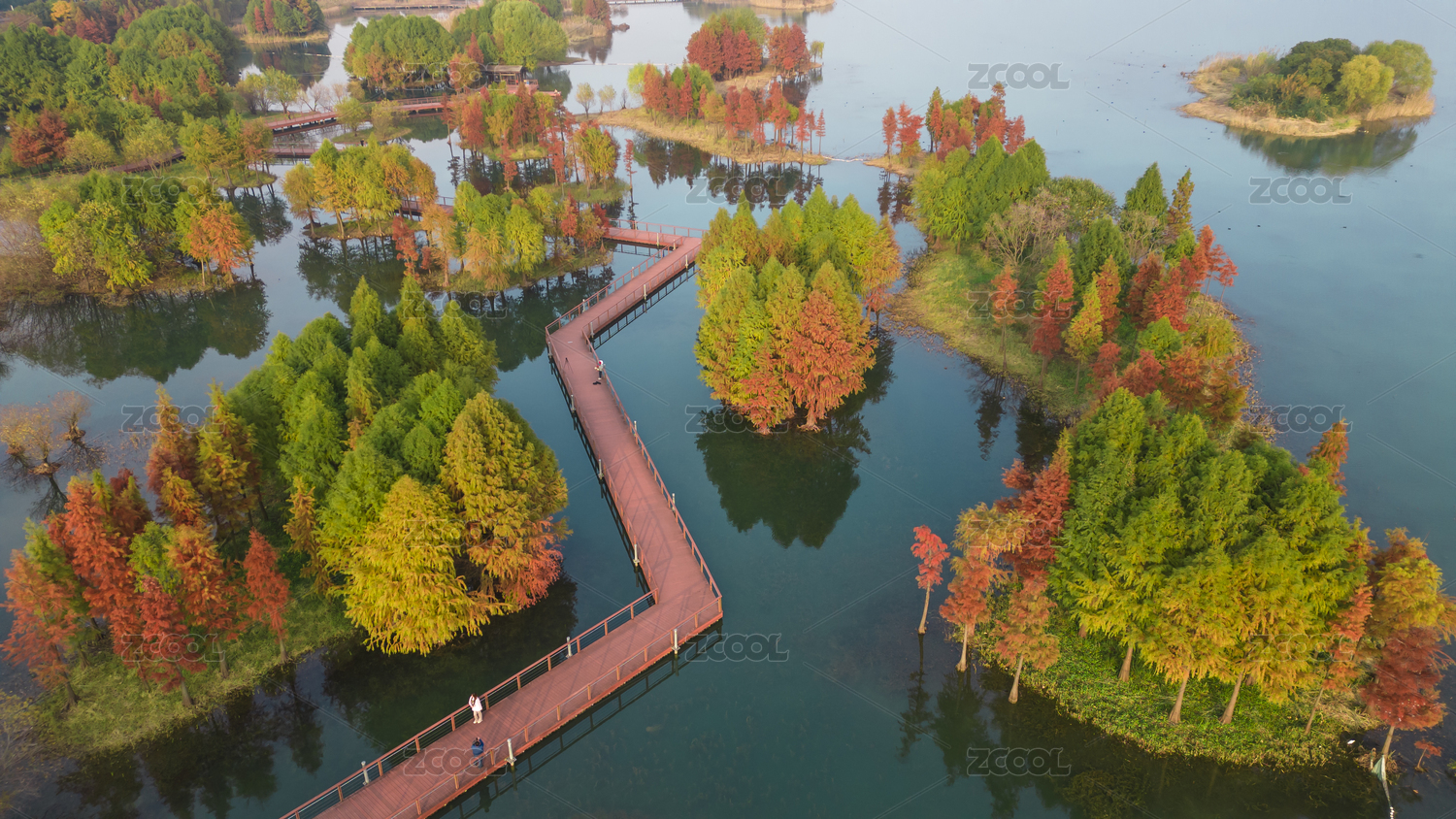 深秋时节 航拍浙江杭州西湖隐秀桥和水杉