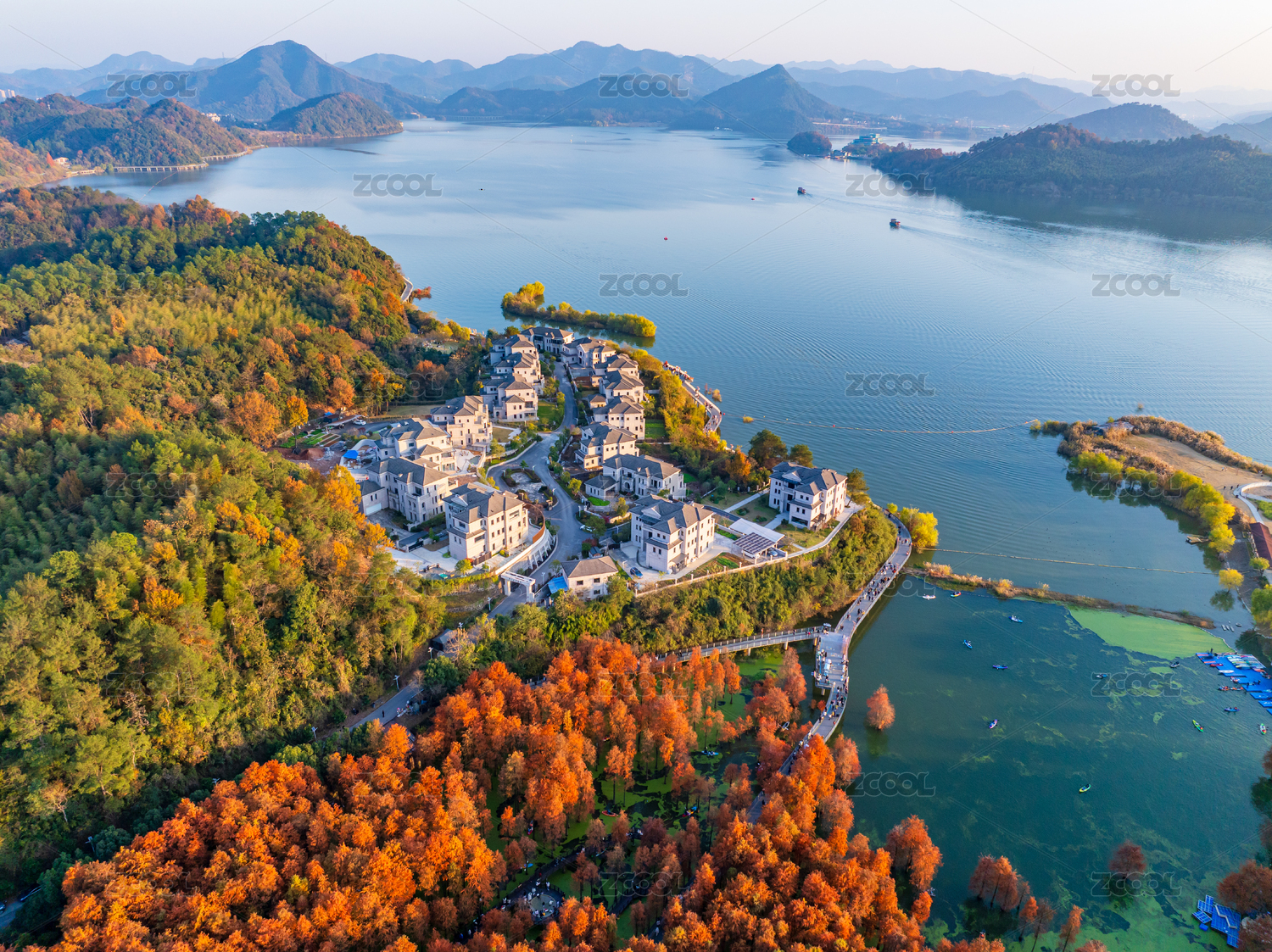 湖畔秋景与山间建筑群