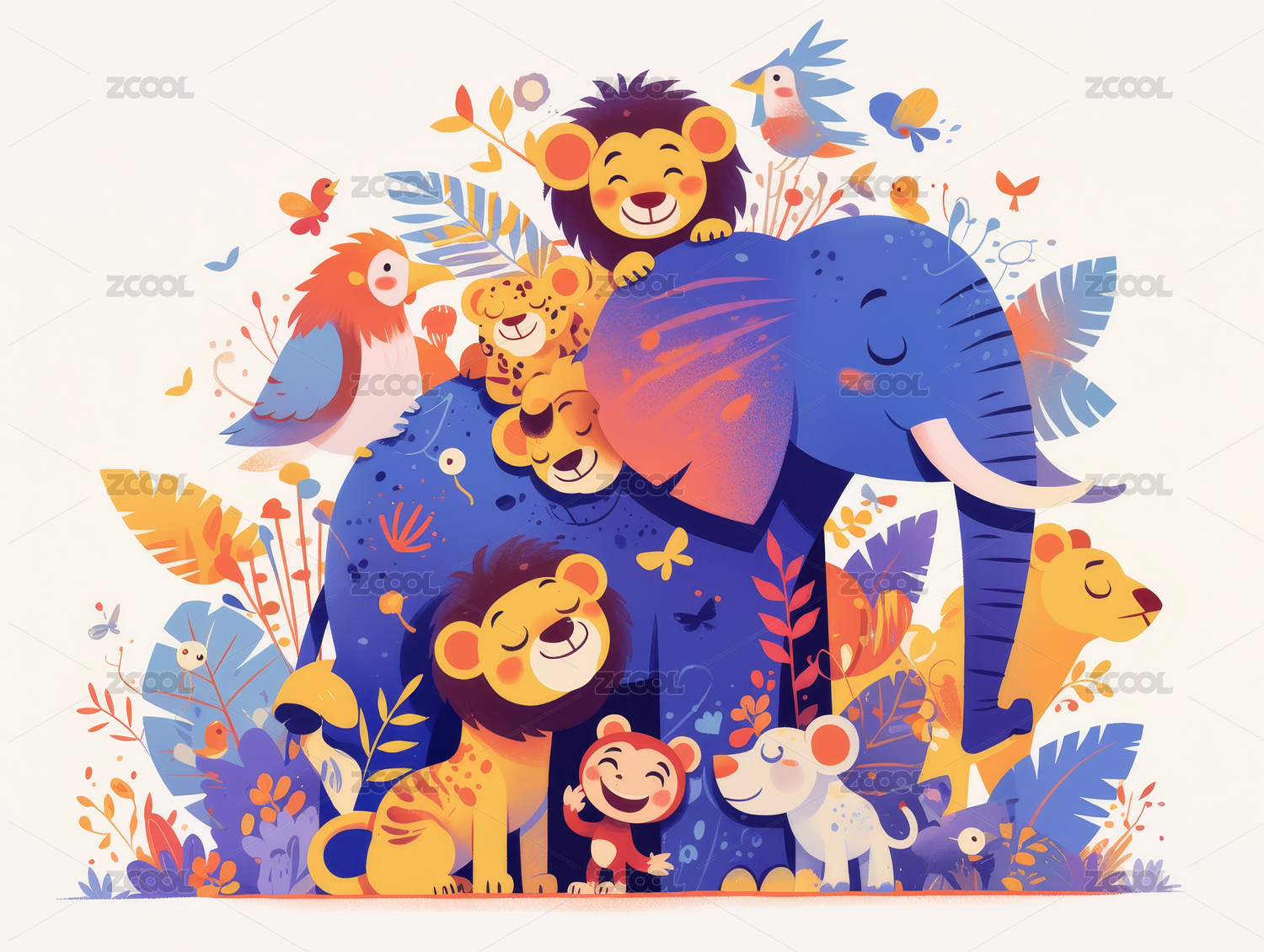 森林,动物,大象,猴子,老虎,人物,插画,卡通,欢乐,自然