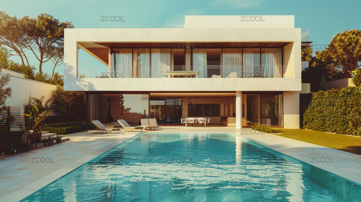 泳池旁的极简风格住宅