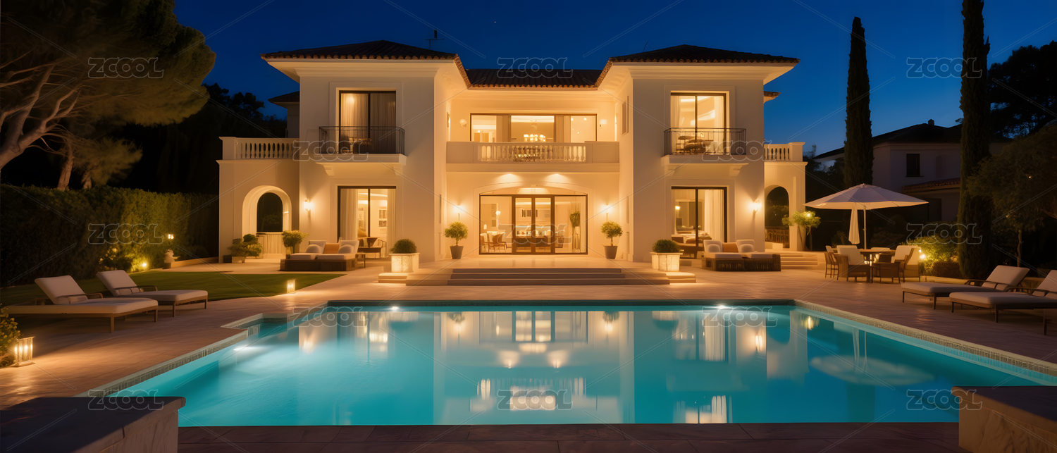 夜幕下的泳池别墅