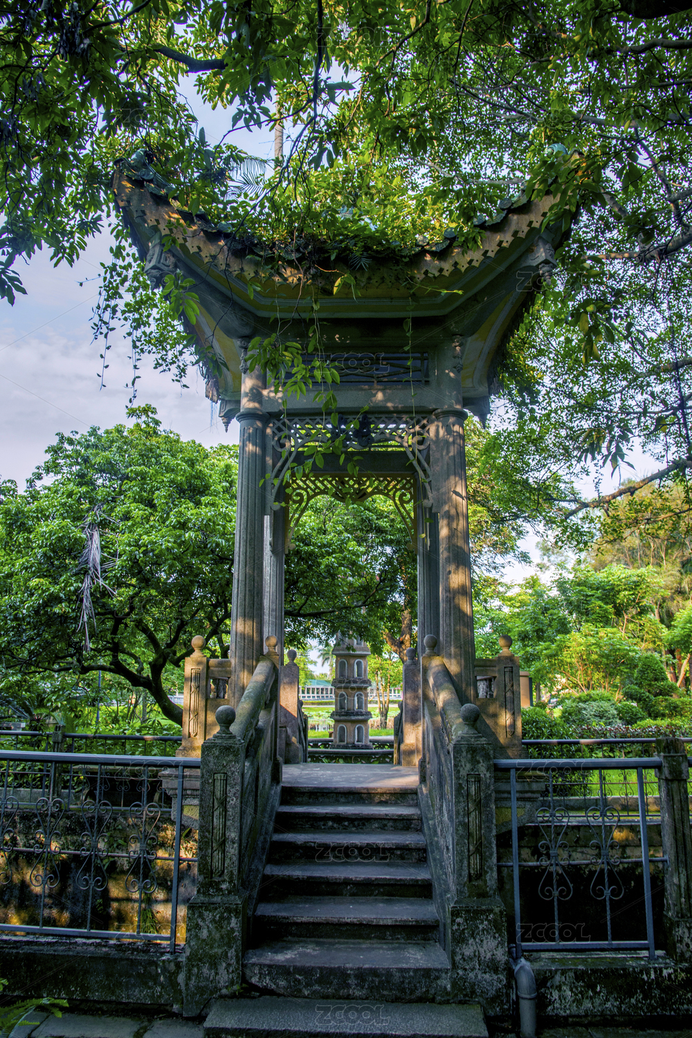 中国浙江省杭州市宝石山上一座凉亭的正面视角