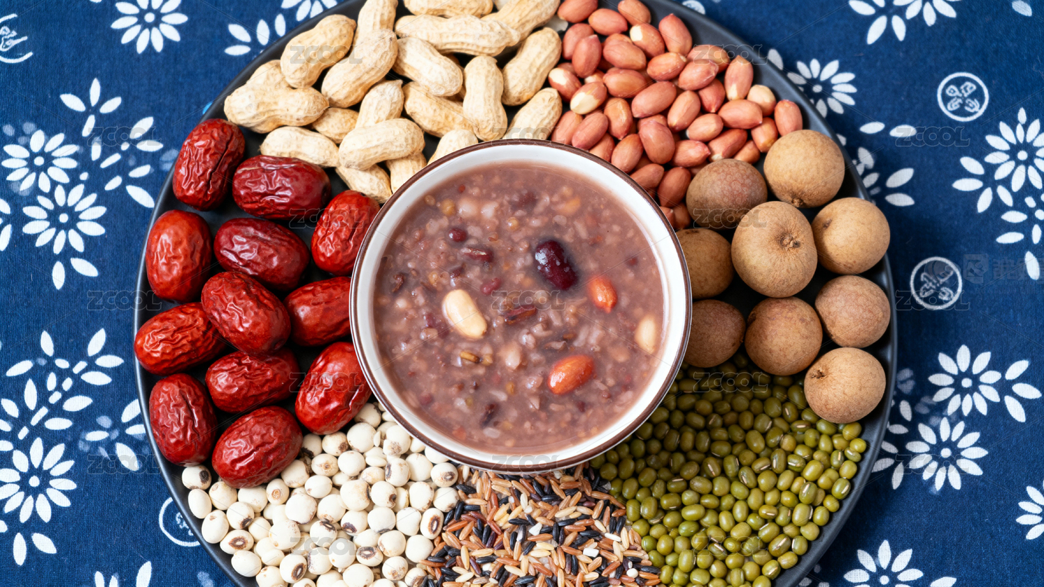 蓝色,餐具,传统,红豆,八宝粥,花生,红枣,莲子,绿豆,糯米