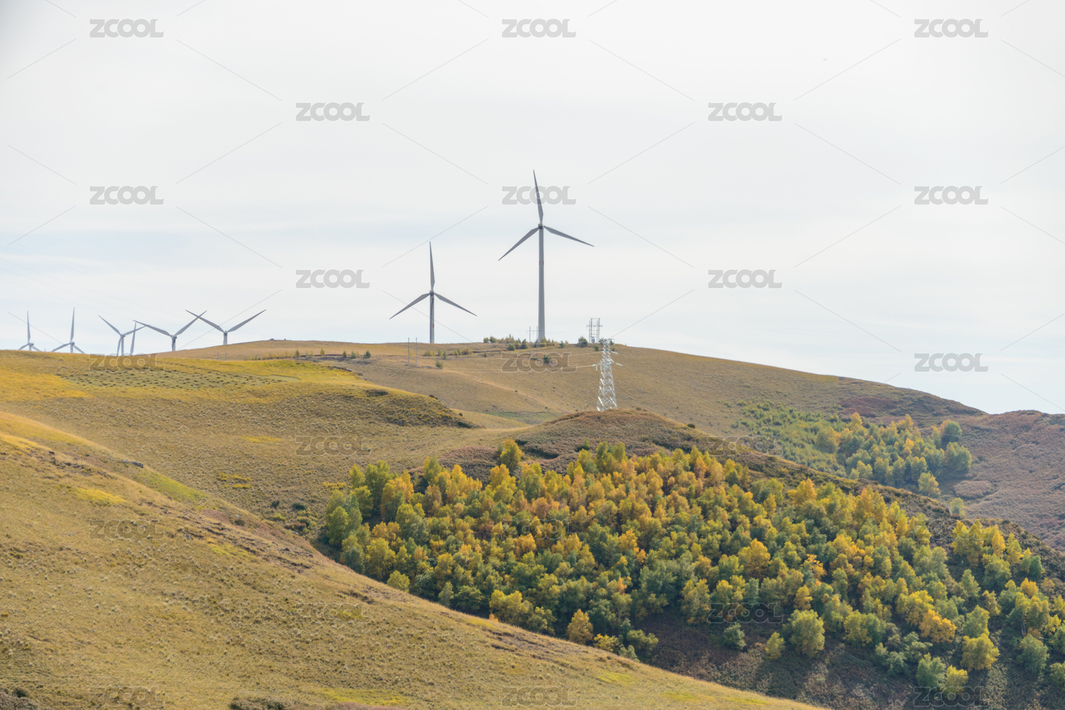 秋季山顶上的风力发电机景观与自然风光