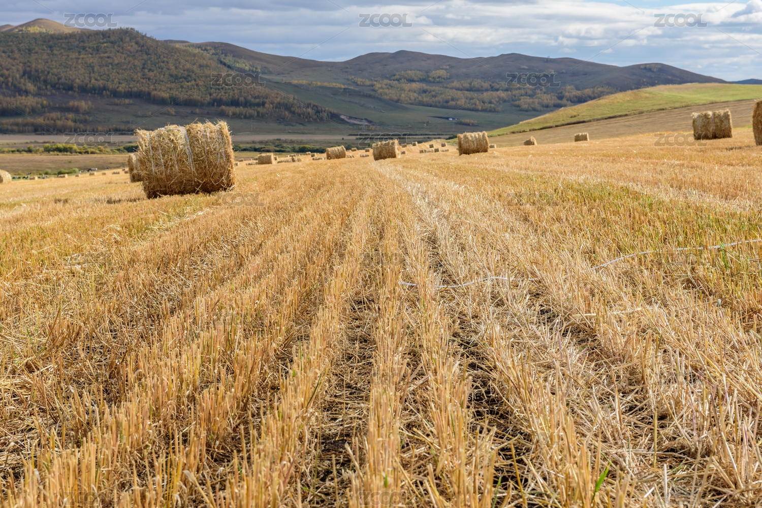 内蒙古呼伦贝尔草原上的亩茬地和干草卷