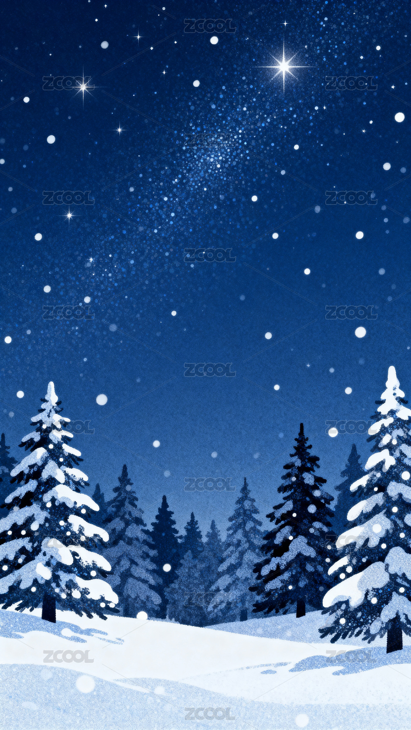 雪覆松树夜空繁星
