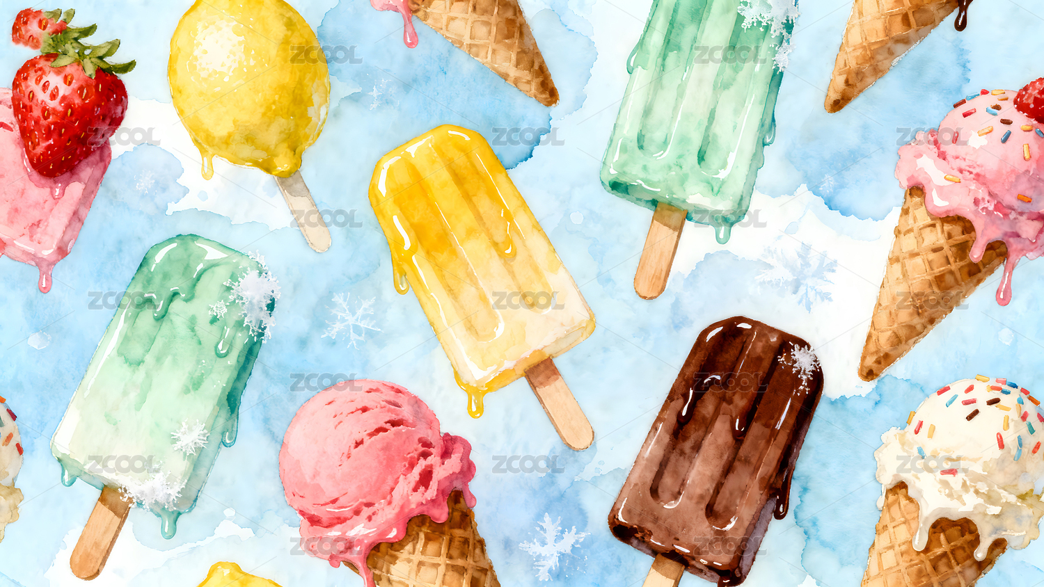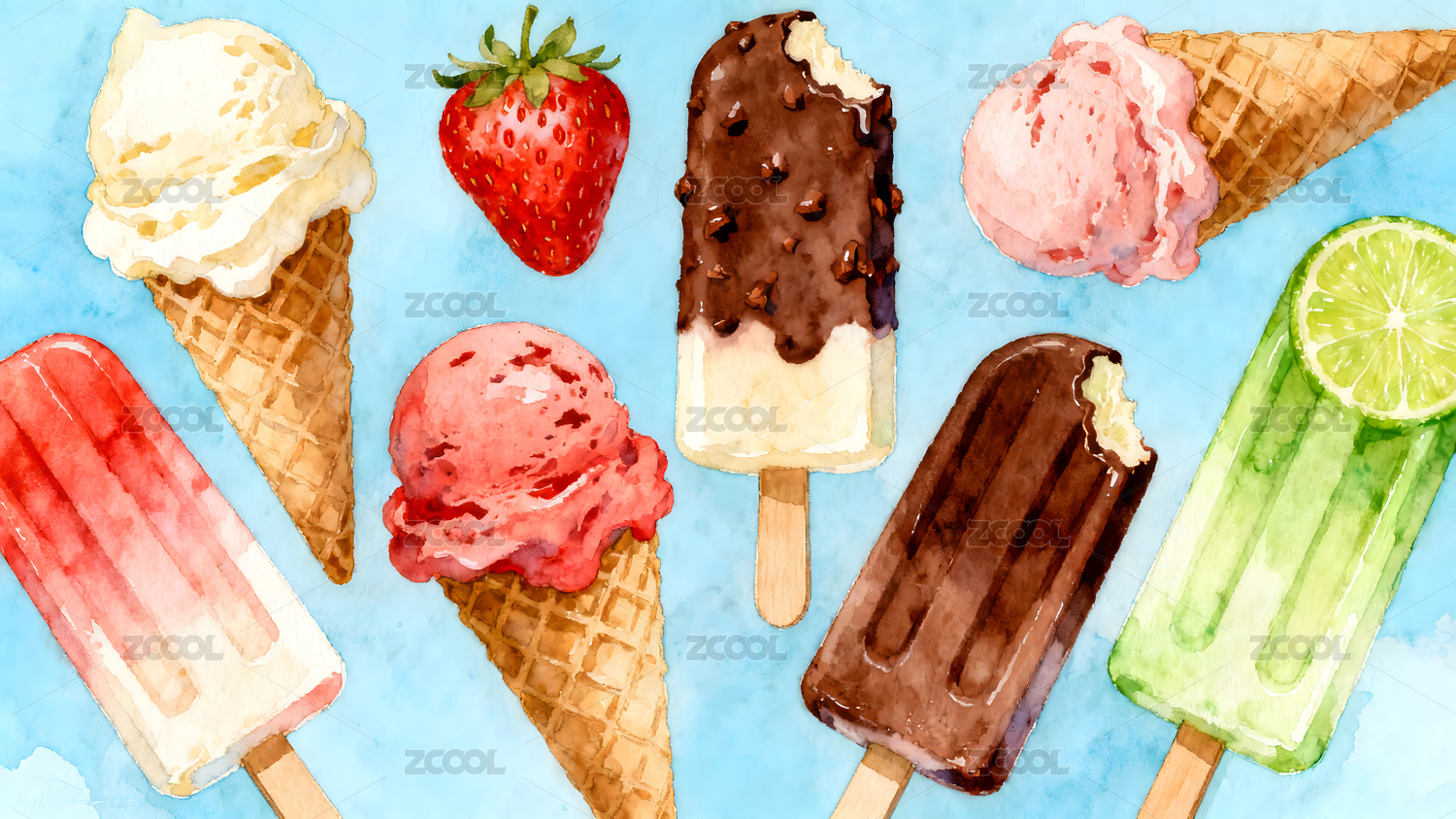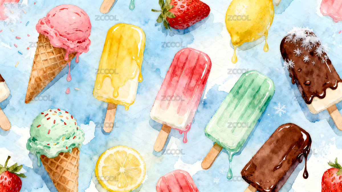水彩风格的冰淇淋和冰棒