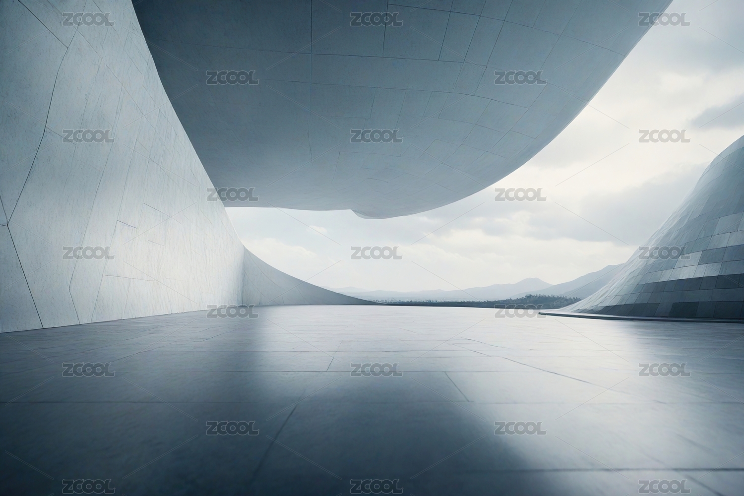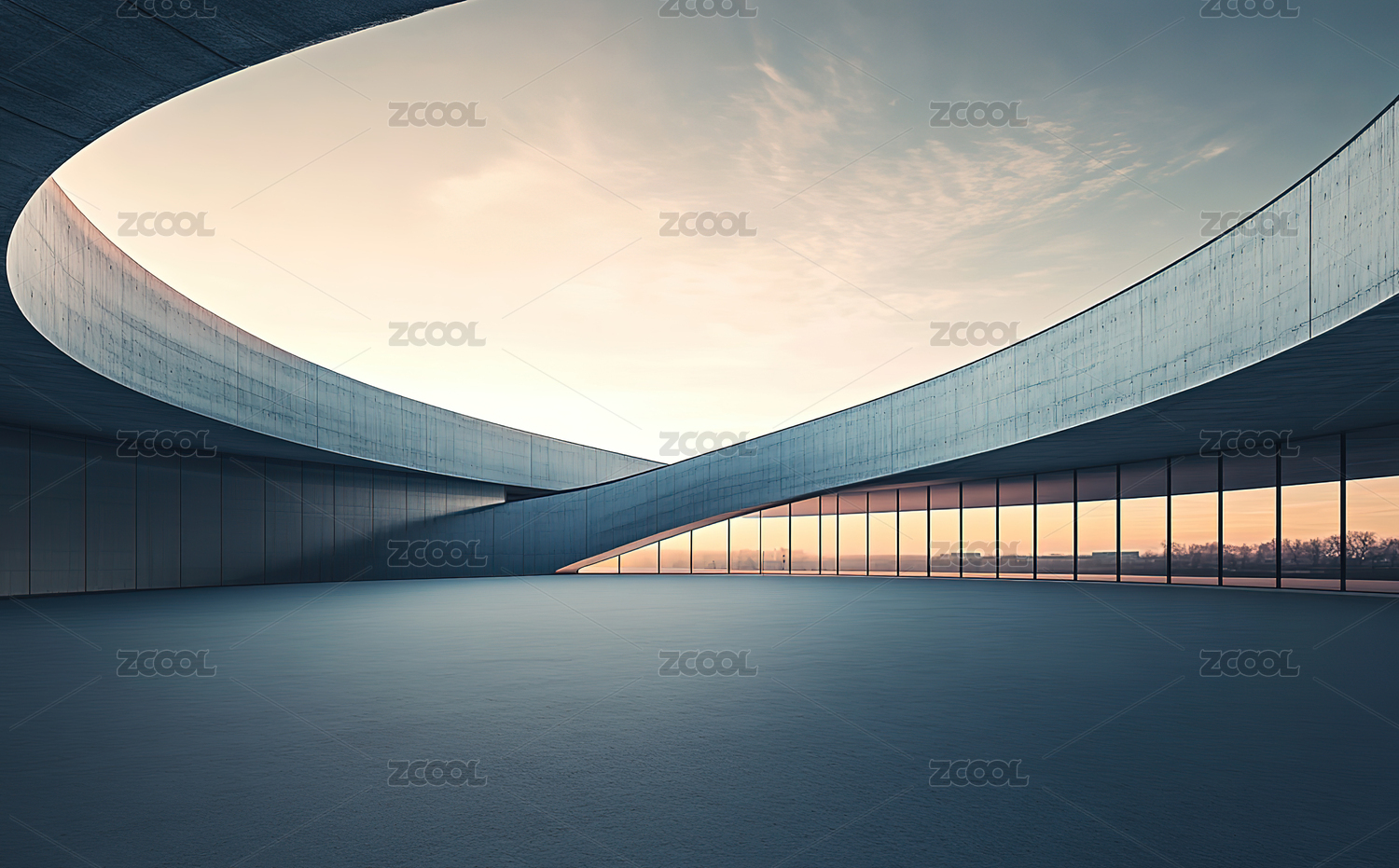 巨大弯曲混凝土建筑与地板反射空间3D渲染