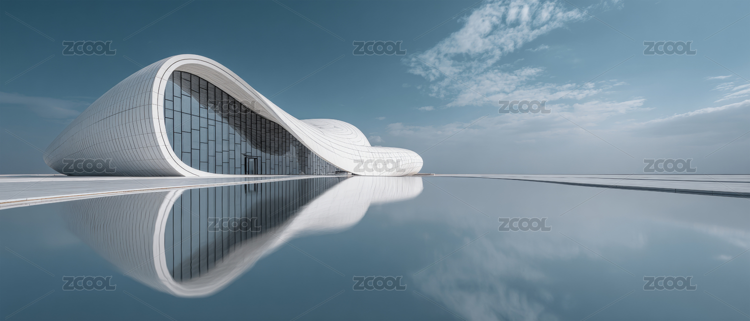 现代,白色,简洁,玻璃,建筑,未来,波浪,水面,倒影,景观