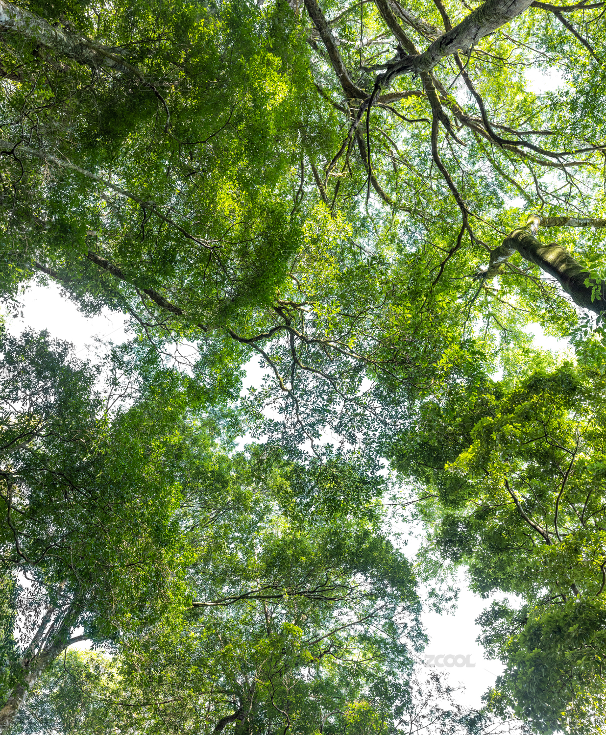 逆光仰拍的森林绿叶参天大树