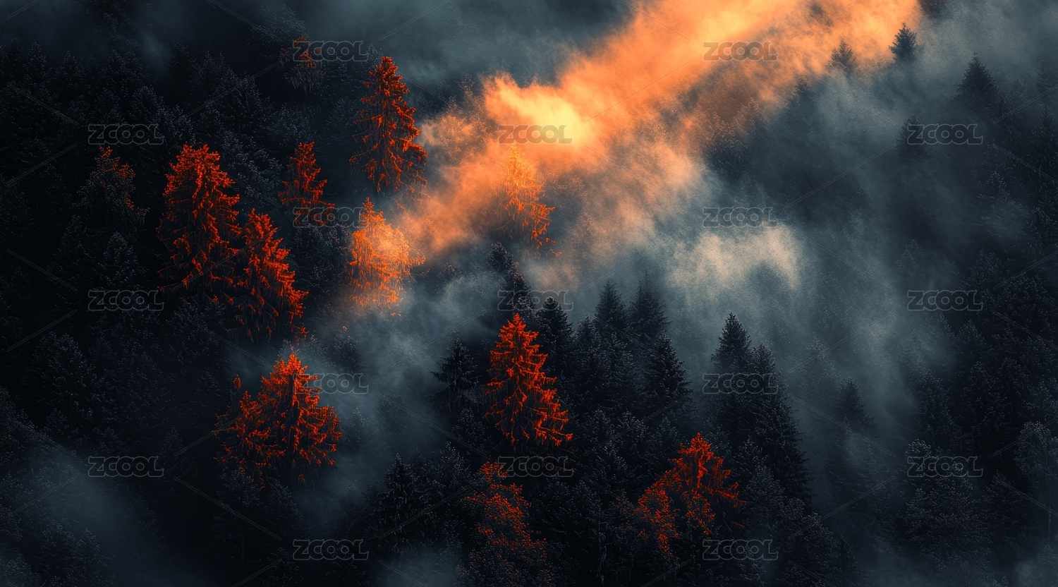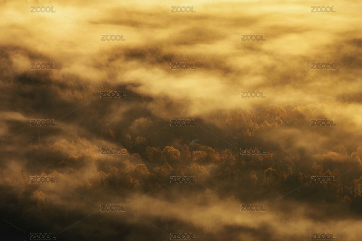 浓雾笼罩着绿色茂密的森林,令人惊叹的早晨