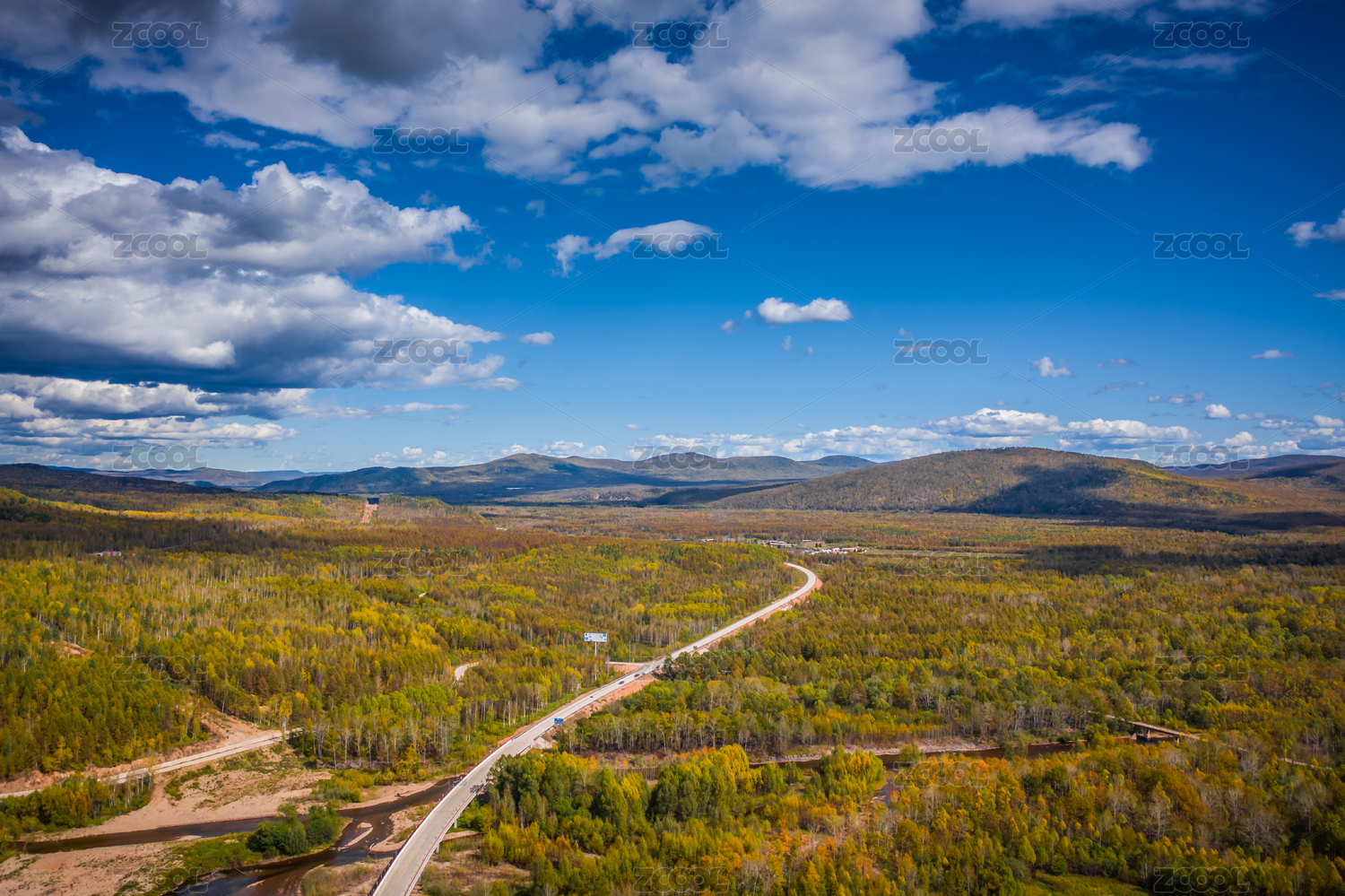 航拍,秋日,山林,公路,金色山谷,蜿蜒道路,蓝天白云,秋景,山脉,树林