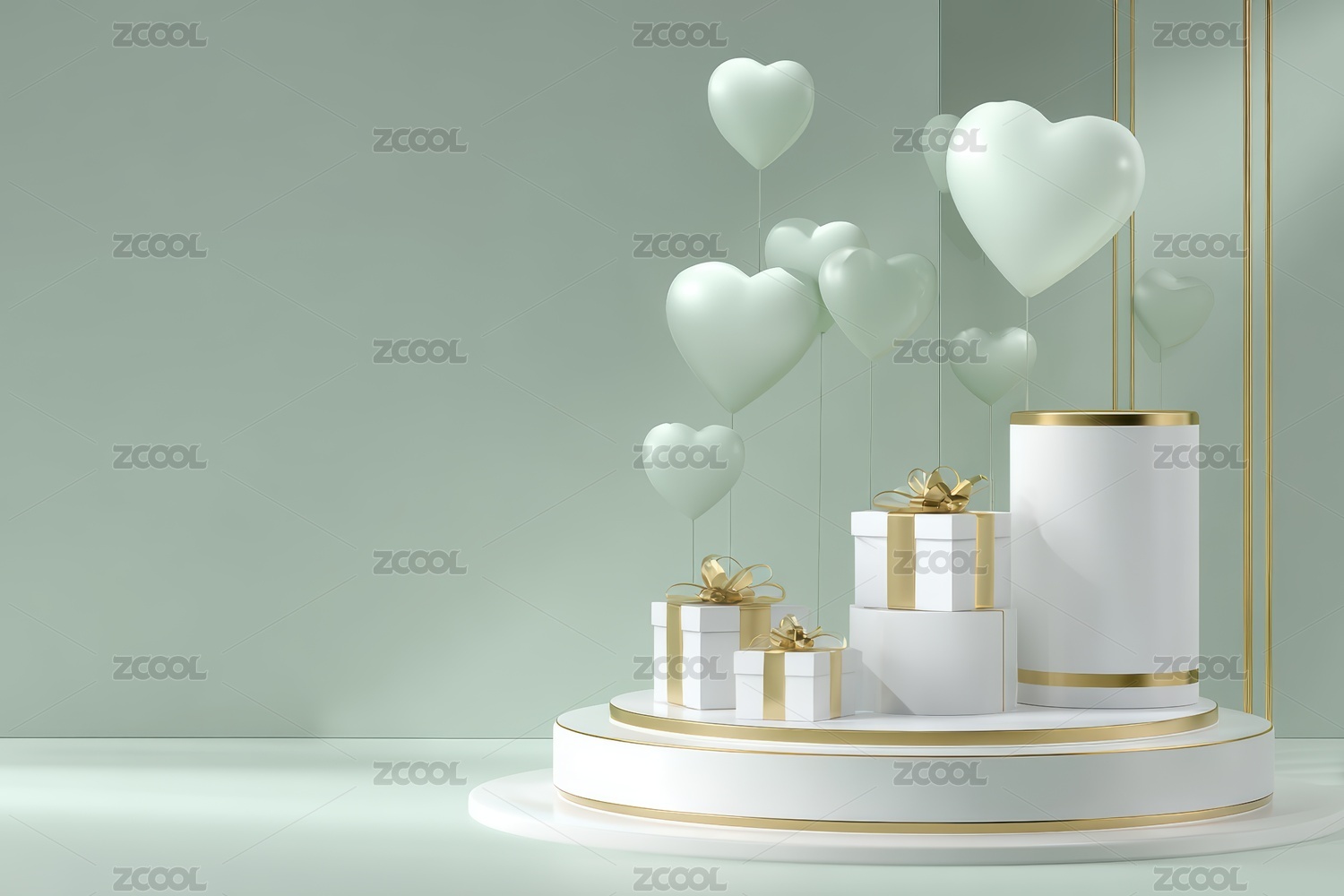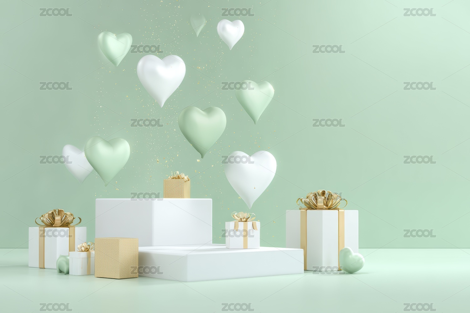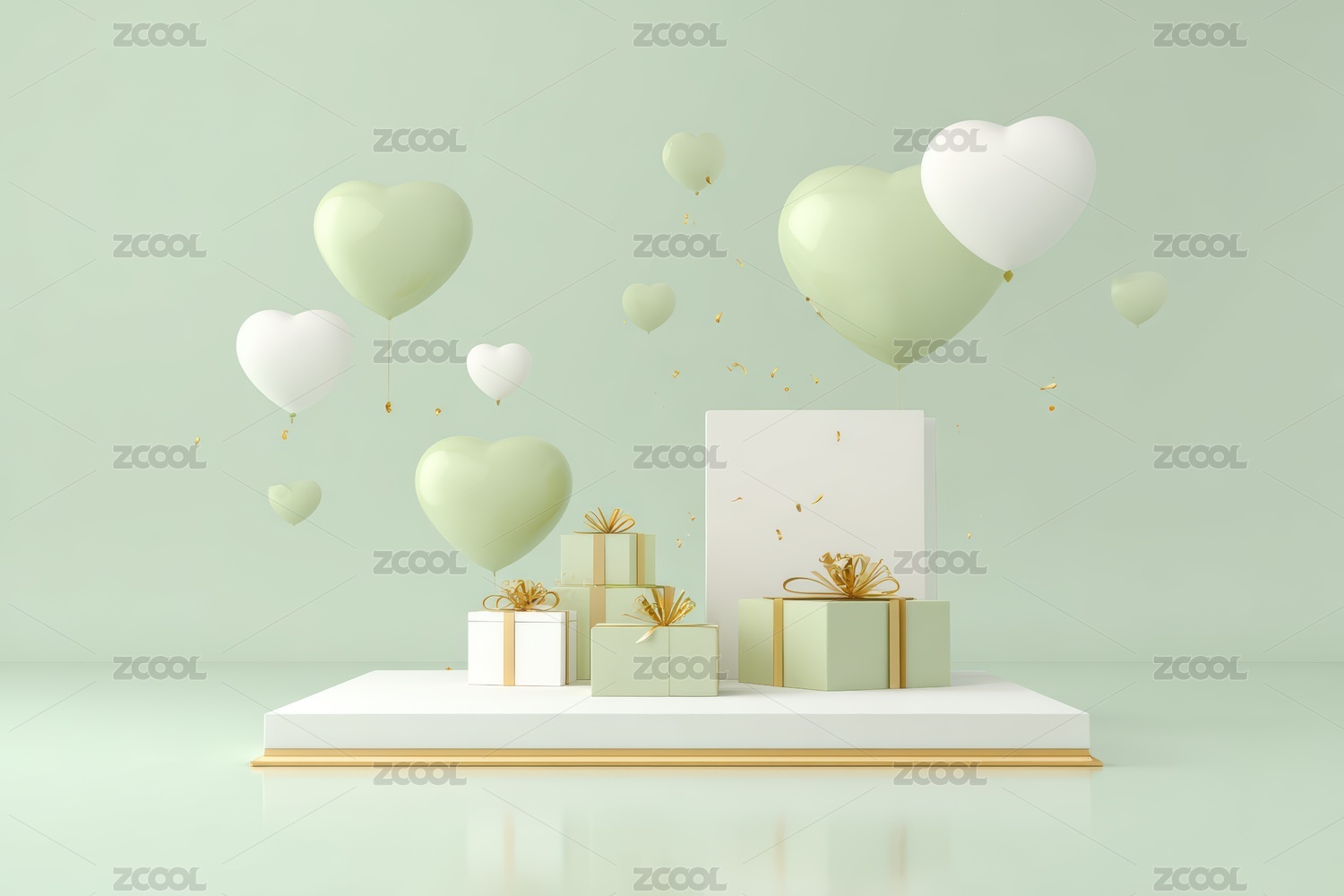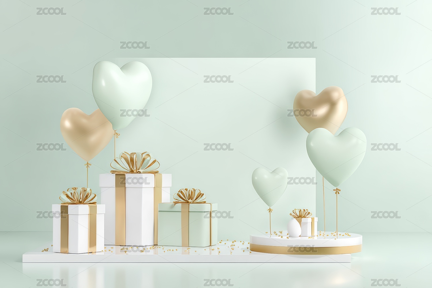 金色,绿色,气球,装饰,爱心,节日,礼品,舞台,盒子