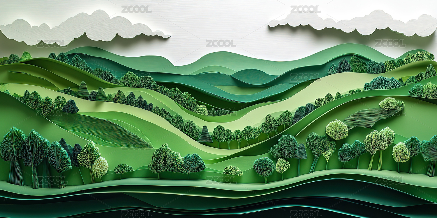 纸艺,山水,层叠,立体,艺术,青绿,插画,设计,质感,视觉