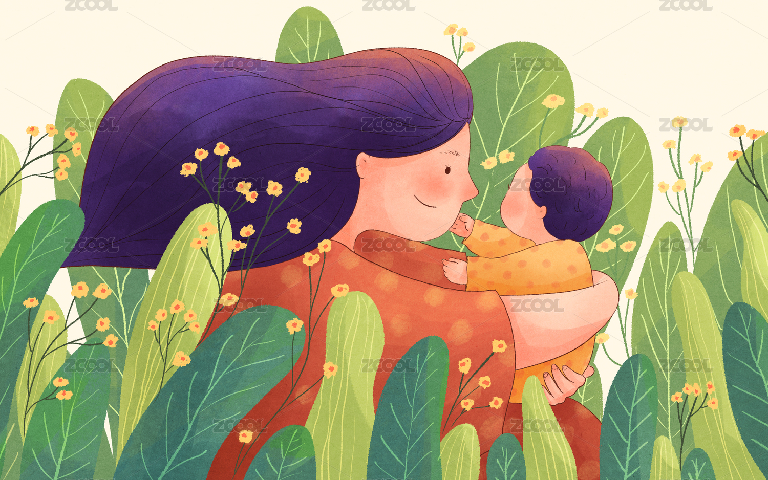 插画,母子,相拥,绿植,花卉,温馨,母爱,亲情,手绘,素材