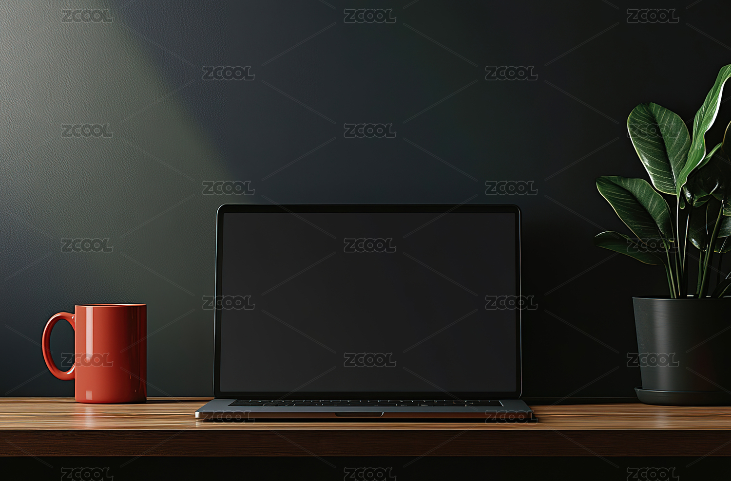笔记本电脑,杯子,桌面,光影,办公场景,简约,色彩对比,屏幕,科技,工作