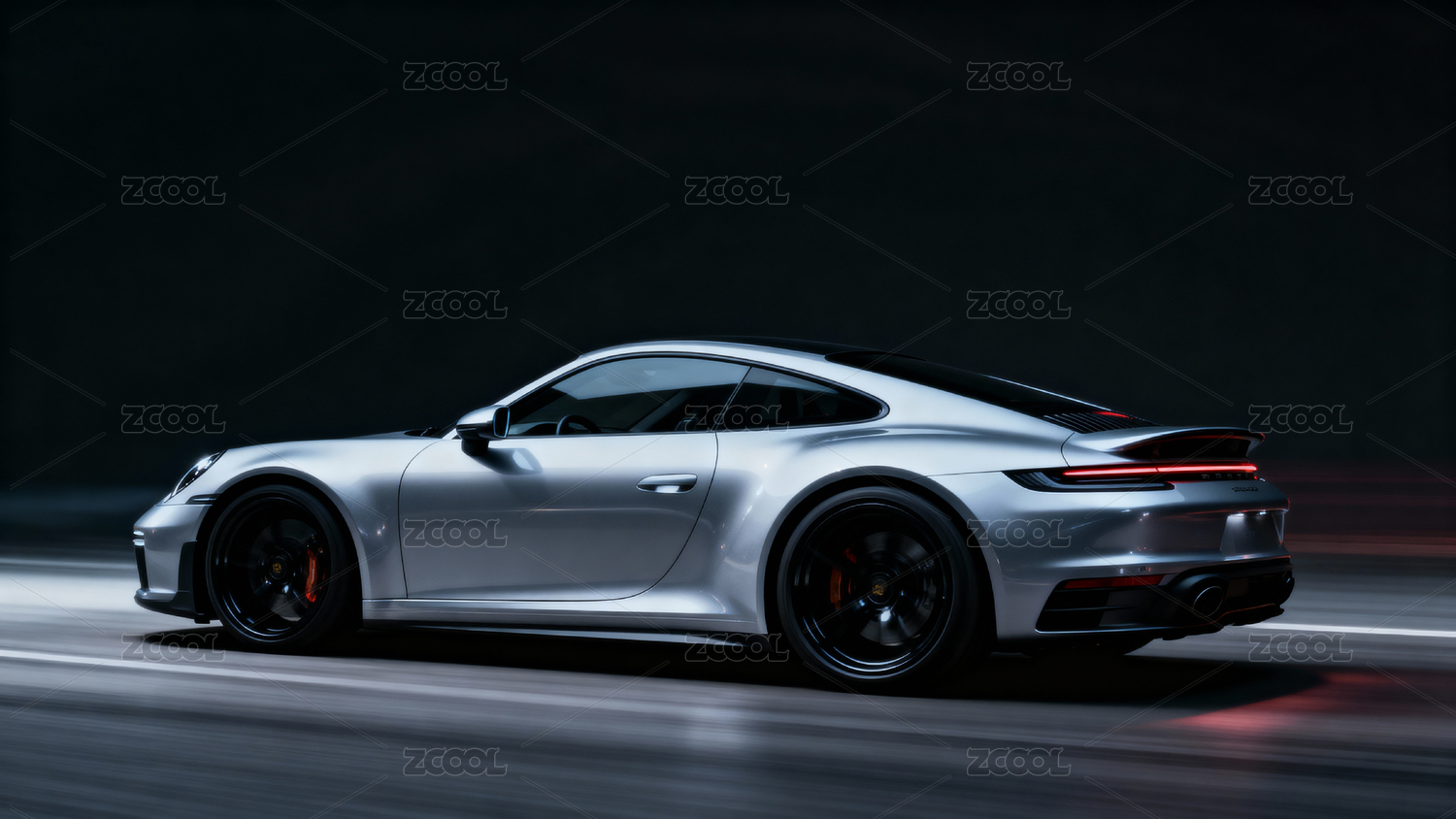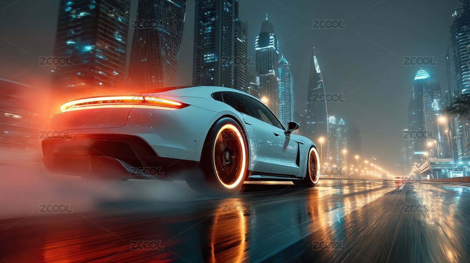 白色跑车,雨天,高速公路,行驶,尾部,尾灯,车轮,流线型,动感,速度