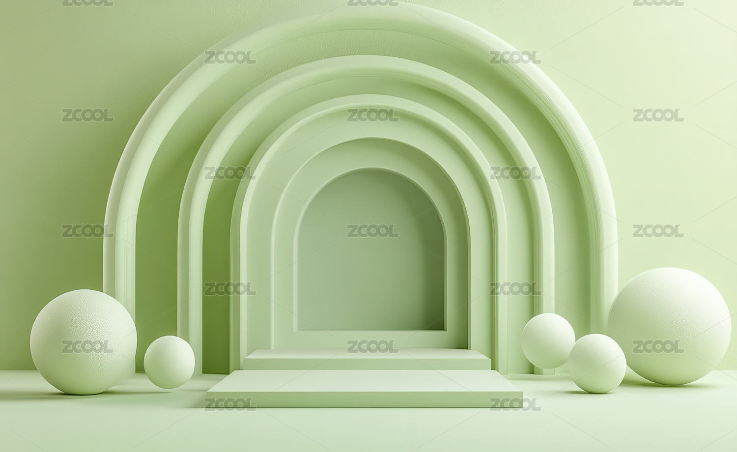 绿色拱门与白色球体的抽象场景