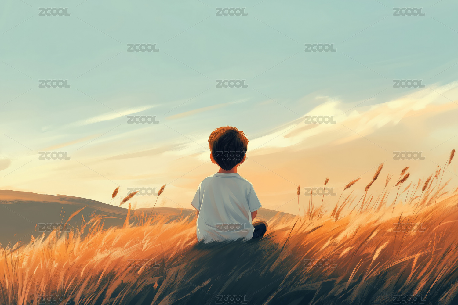 草坪上一个小男孩孤独的背影