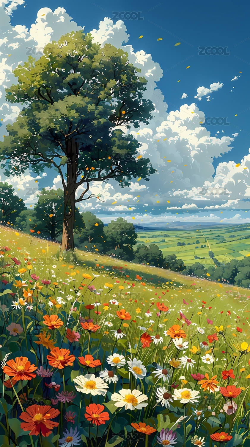 户外草地野花森林天空风景插画