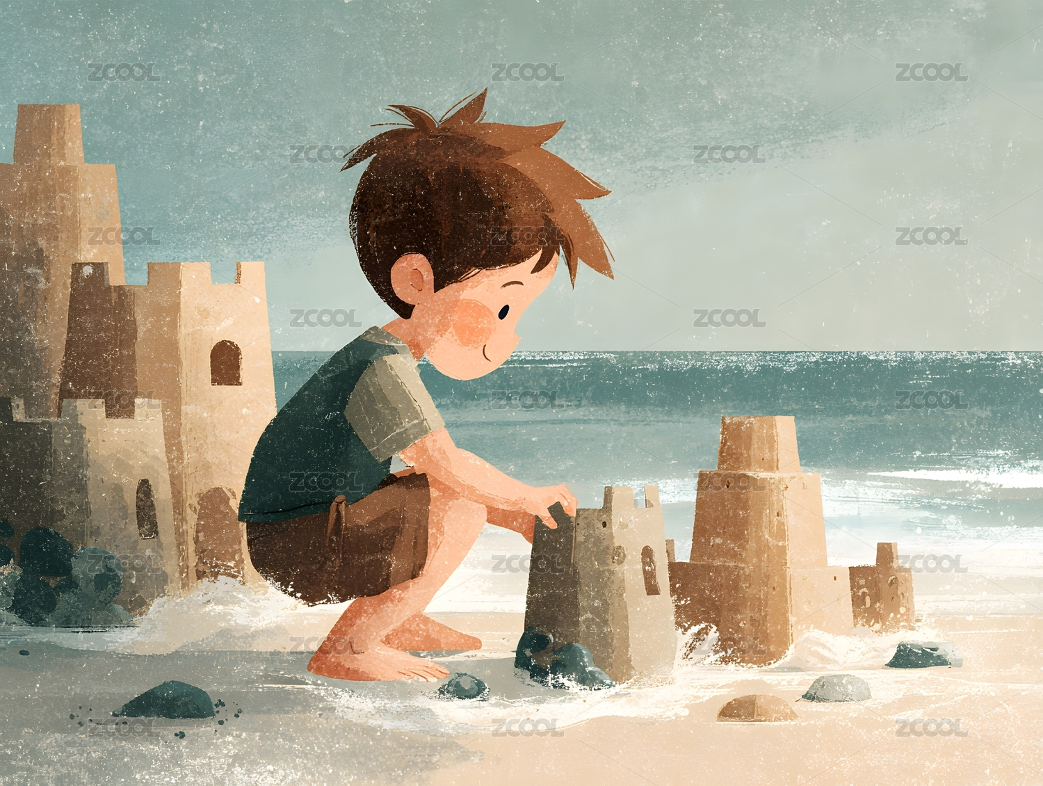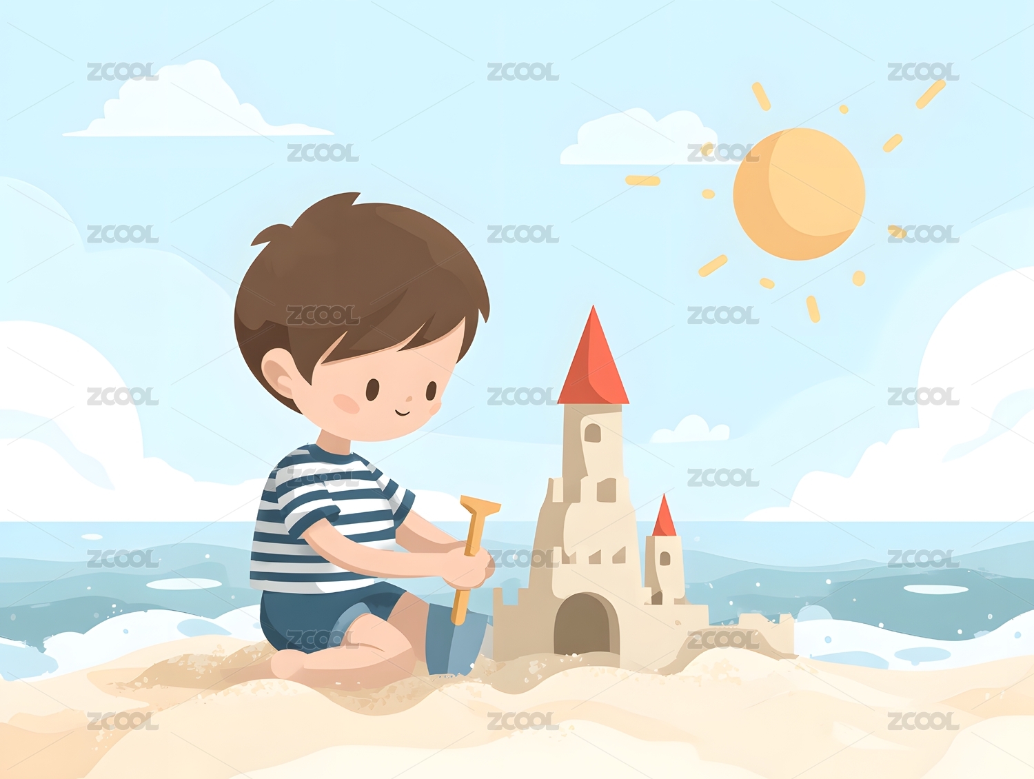 海滩男孩堆沙堡 阳光明媚 水彩画