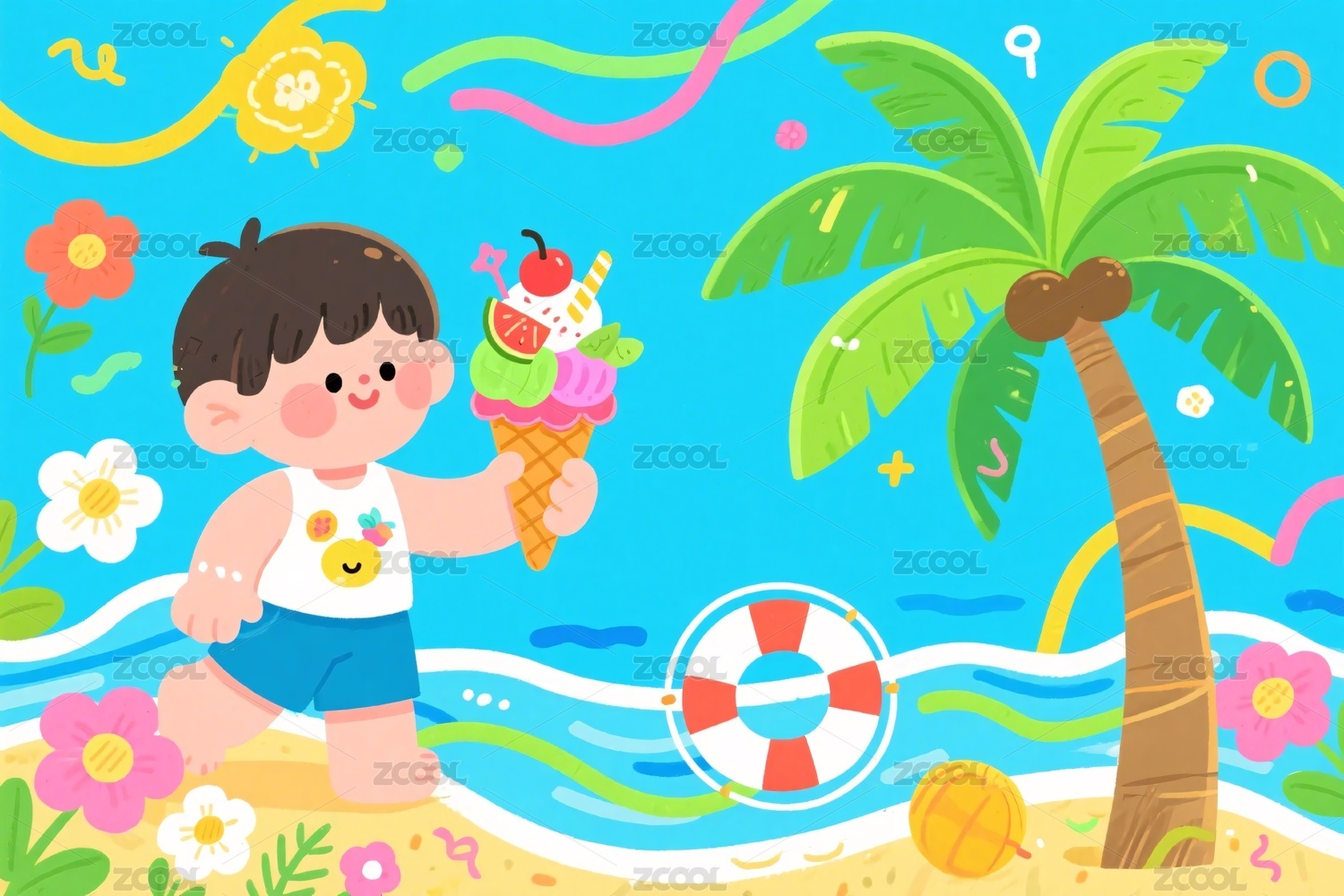 卡通,快乐,插画,人物,建筑,海滩,嬉戏,阳光,海浪,童趣