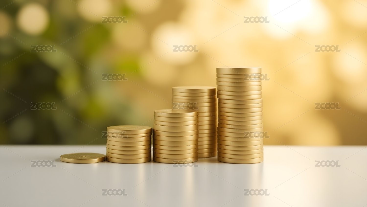 金色硬币堆叠在白色桌面上