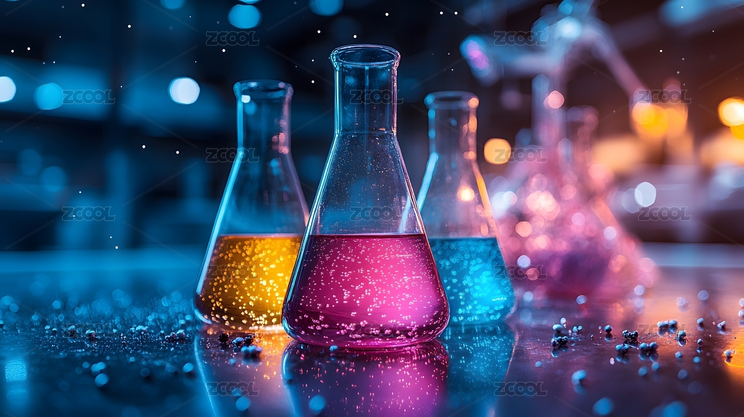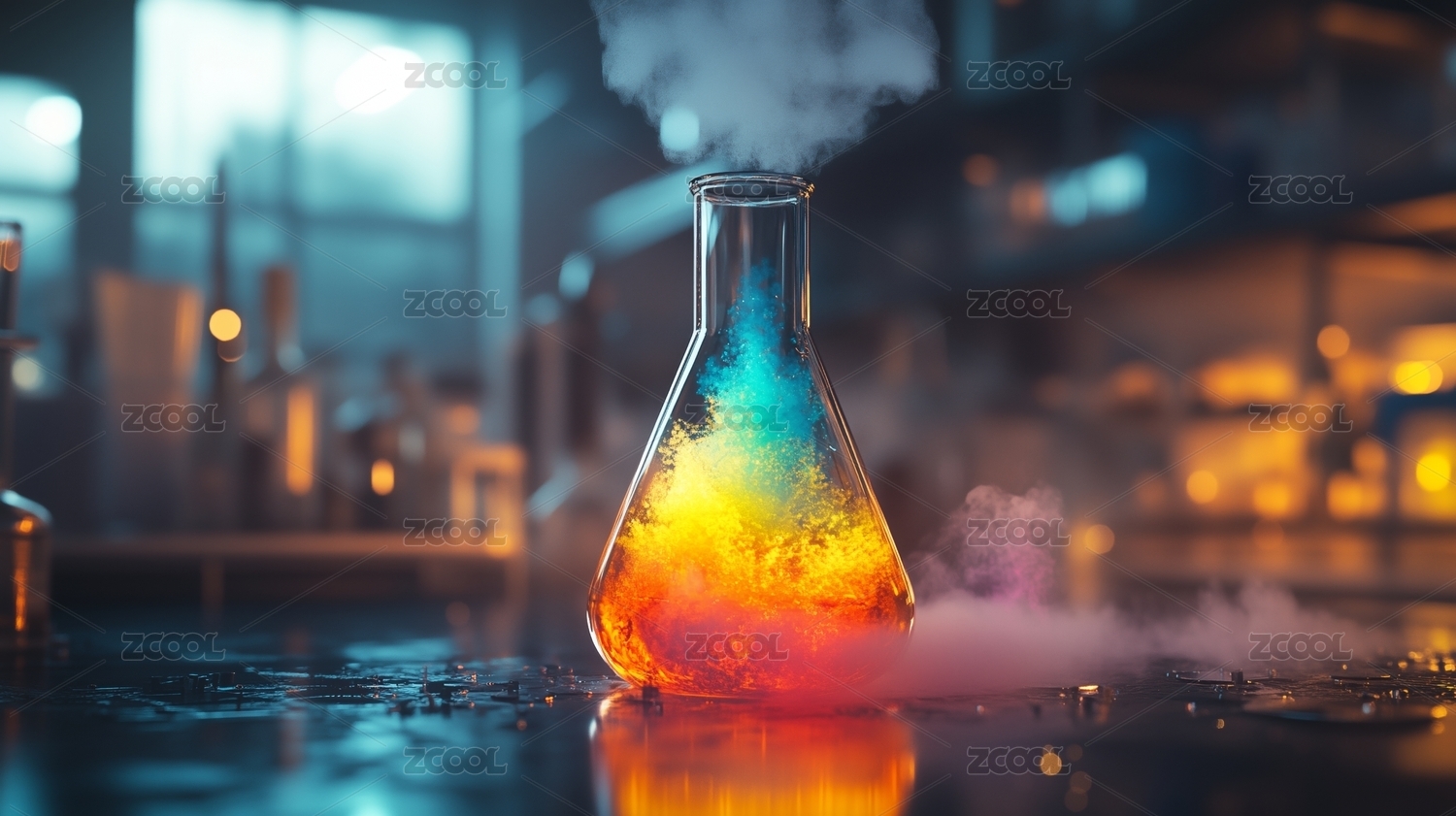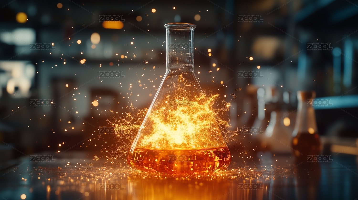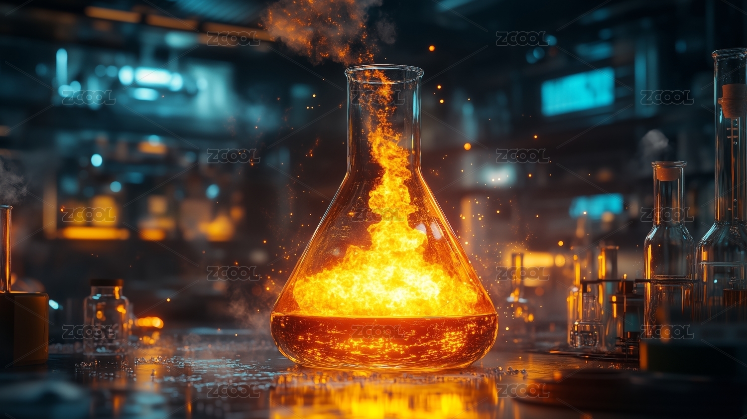 艺术设计,细节,未来感,科技感,火花,生物科学,实验室,仪器,化学反应,烧瓶