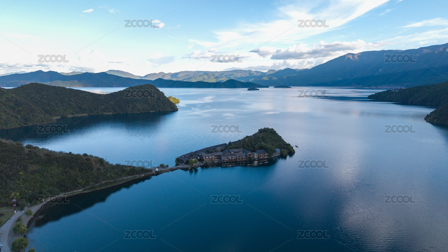 泸沽湖里格半岛白昼下午日落高视角航拍