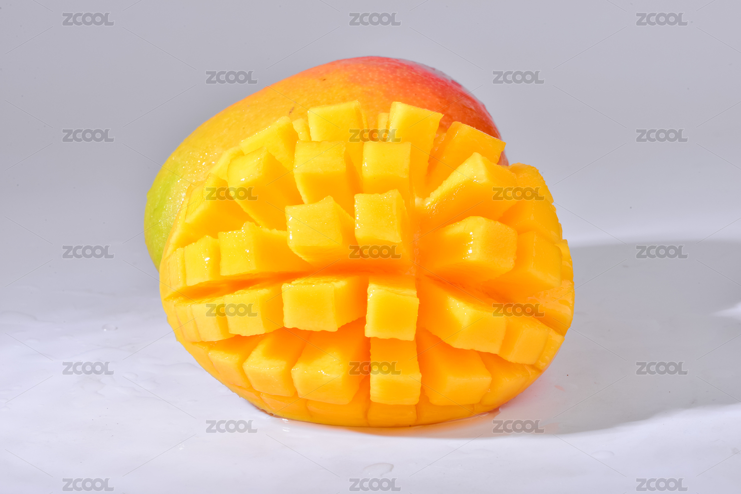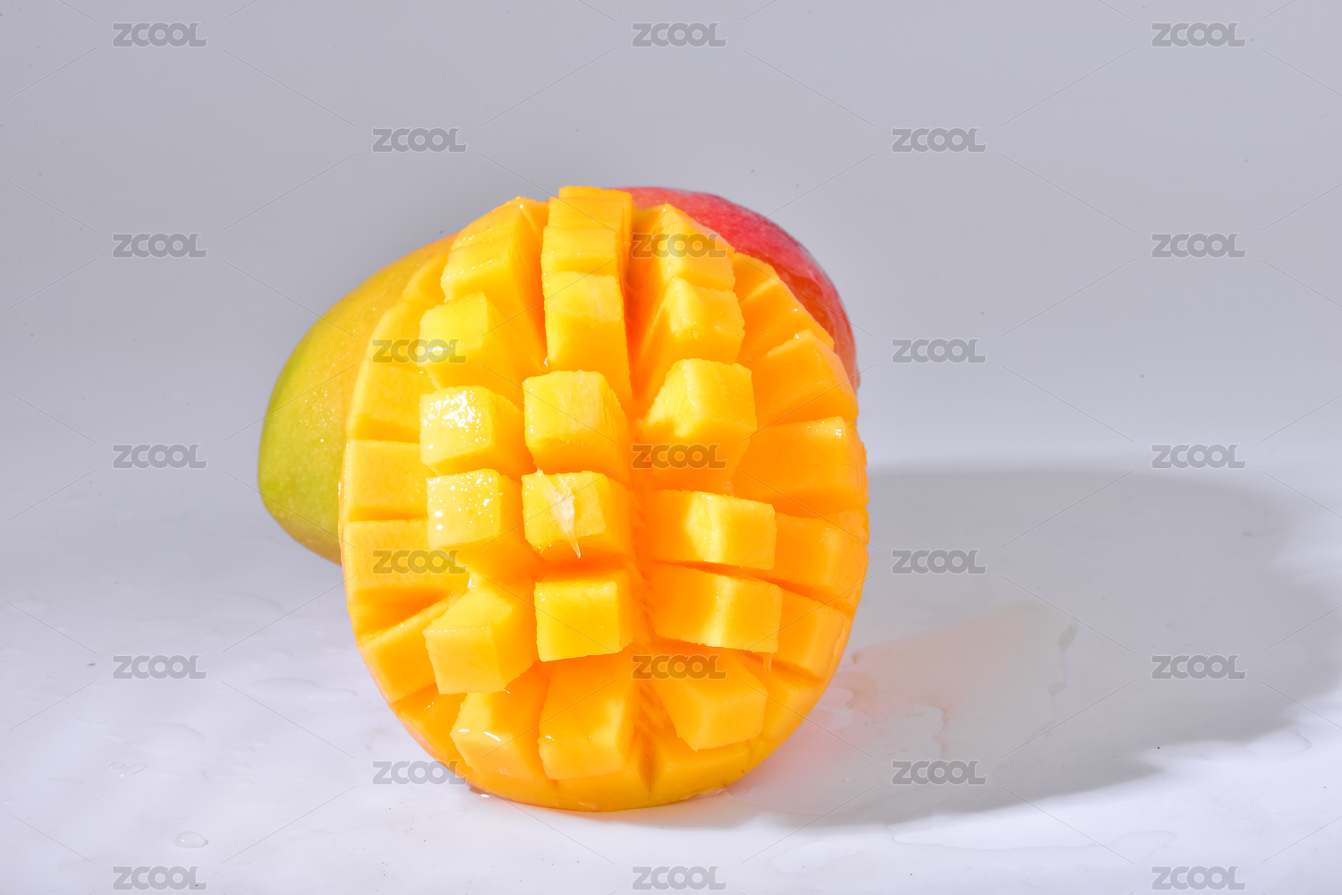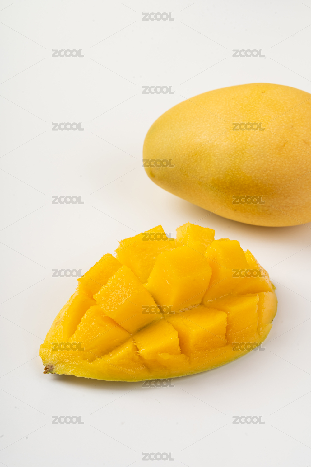 白色背景前有一个被切开的新鲜芒果