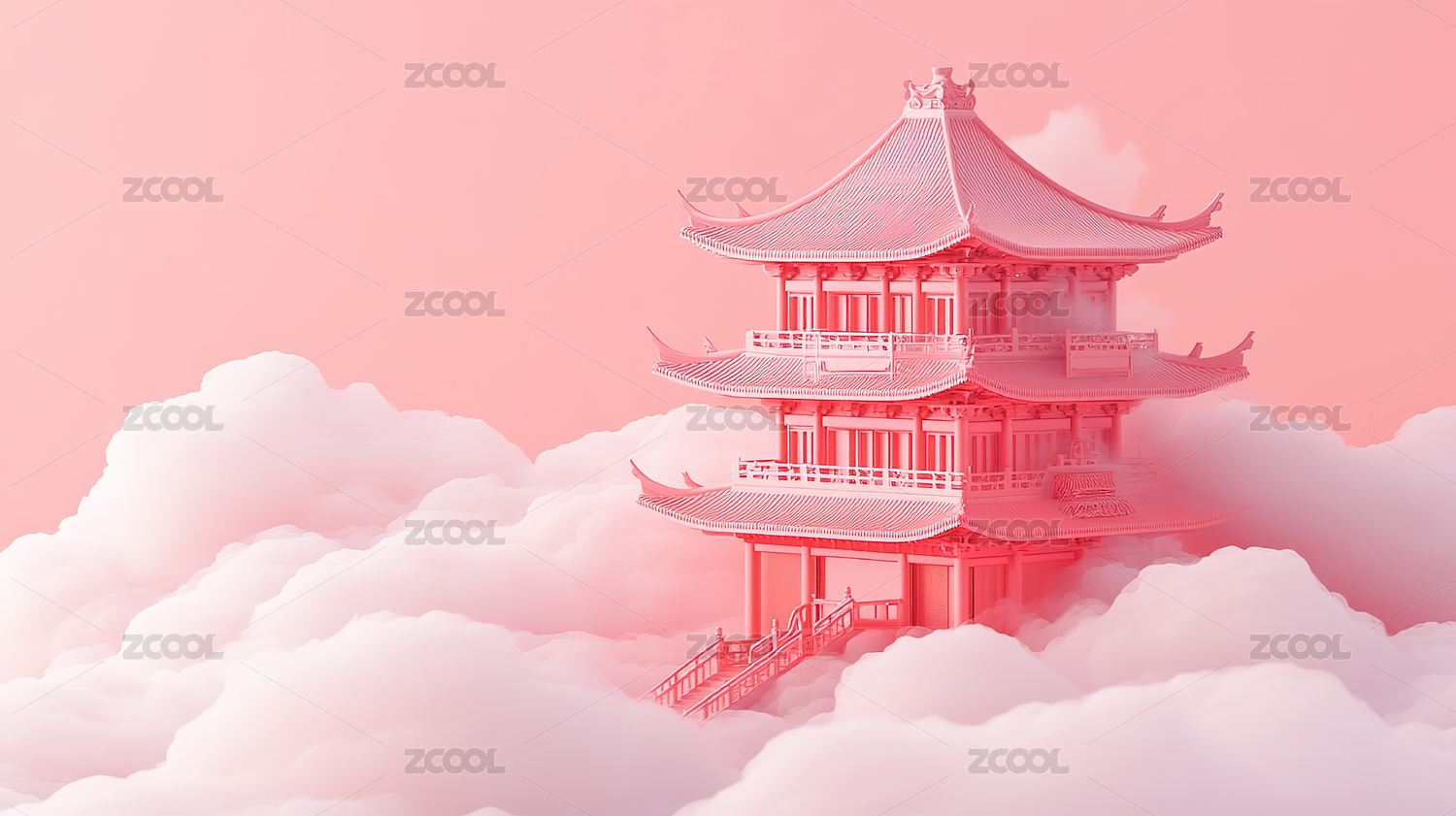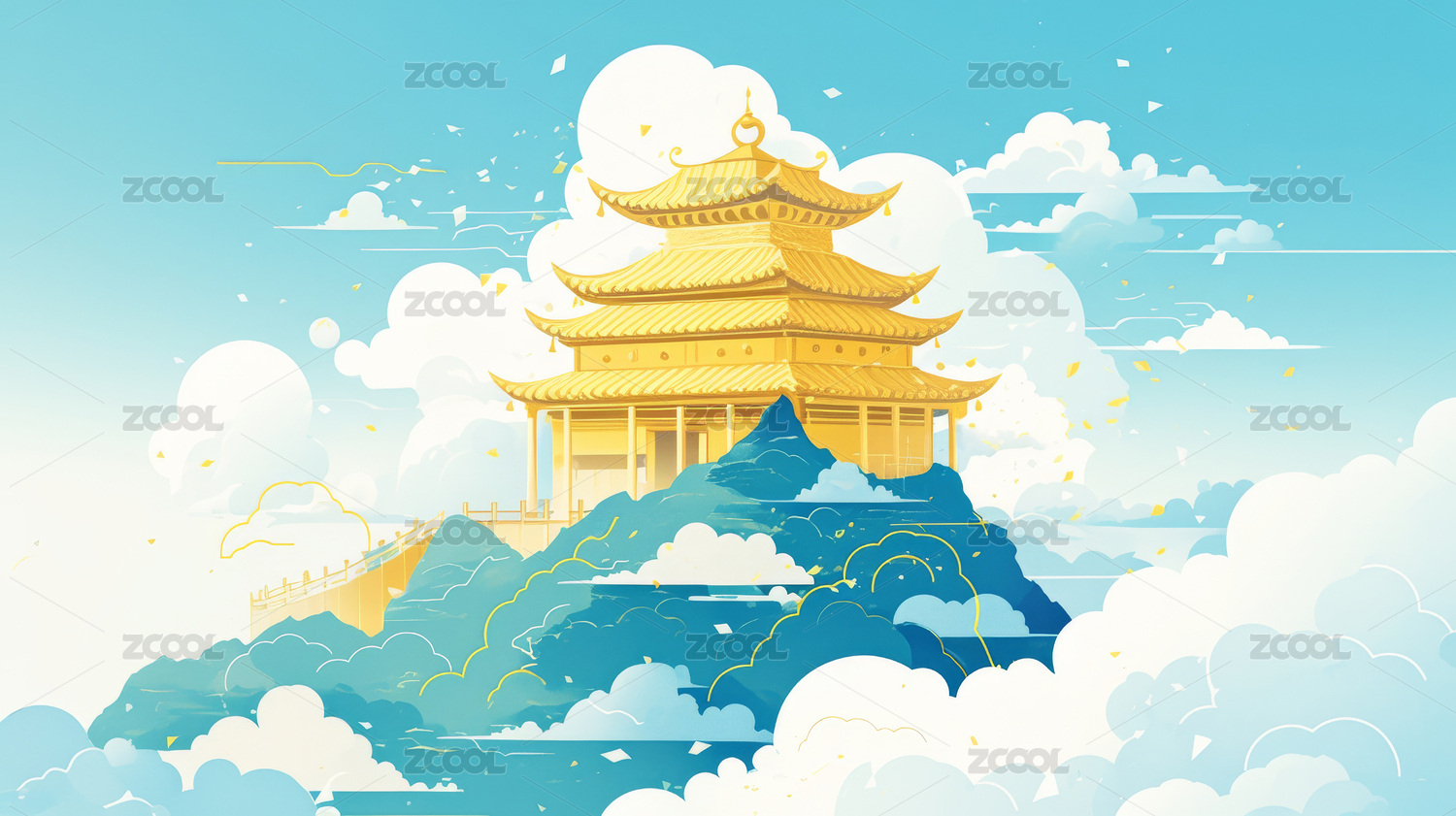 古楼,金色,楼阁,古风,云海,山峦,夜景,插画,中国风,传统建筑
